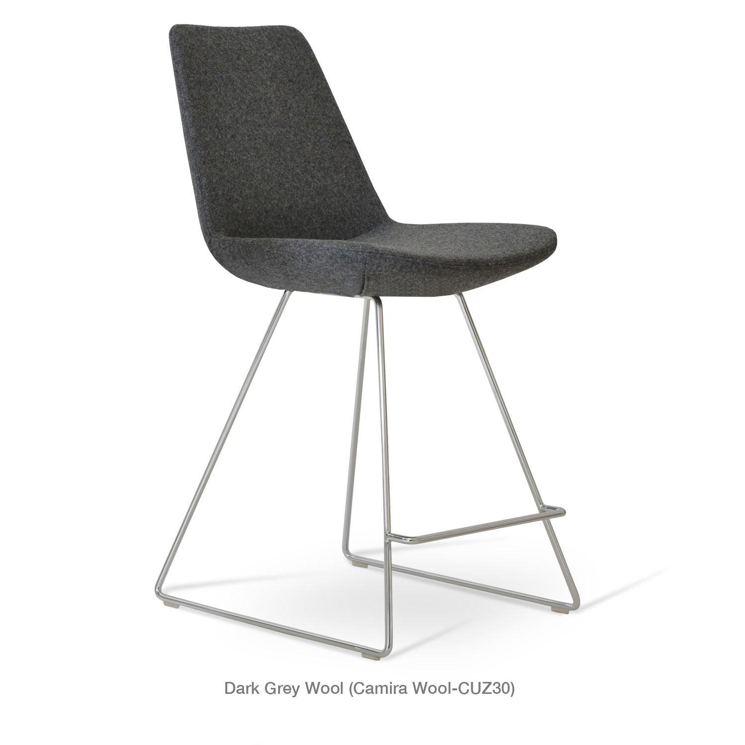 The Eiffel Wire Stool is a contemporary counter and bar stool with a comfortable upholstered seat and backrest on a solid chrome steel sled base. Each leg is tipped with a plastic glide embedded into the metal wire. The seat has a steel structure with “S” shape springs for extra flexibility and strength. This steel frame is molded by injecting polyurethane foam. Eiffel seat is upholstered with a removable velcro, enclosed leather, PPM, leatherette, wool, and Camira organic wool slipcover. Eiffel Wire Stools may be upholstered with various other colors as a special order with a minimum quantity required. The stool is suitable for both residential and commercial use.