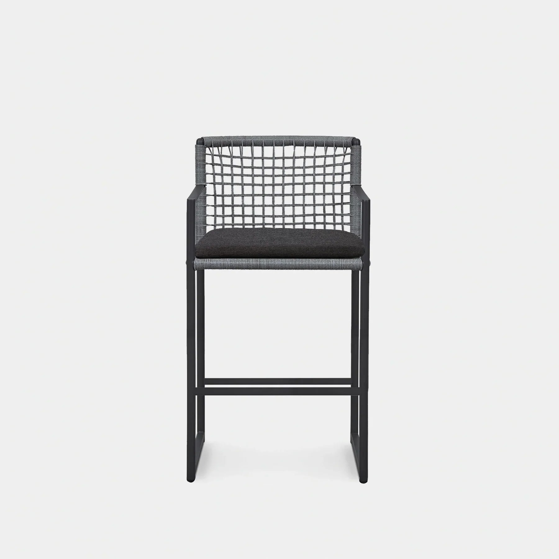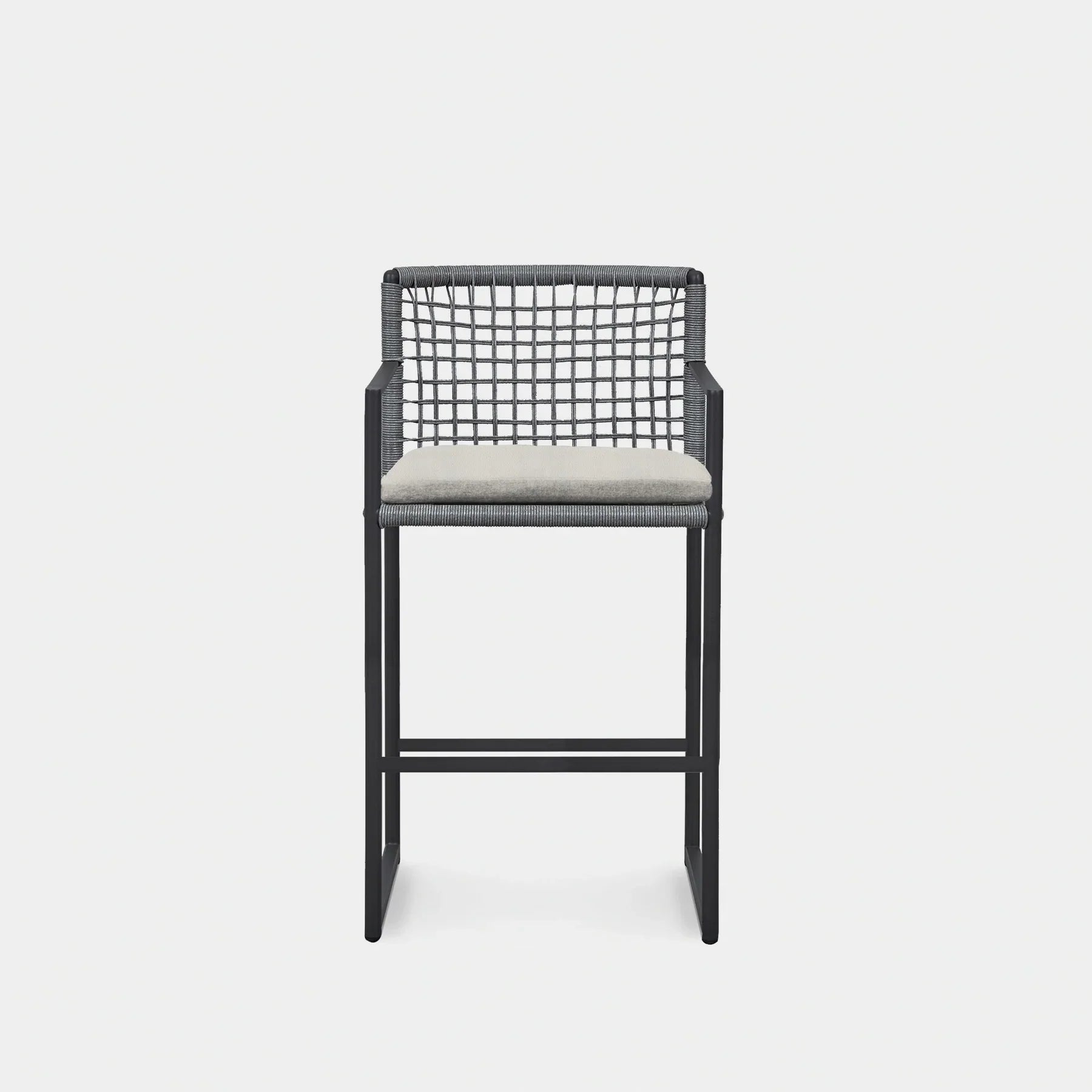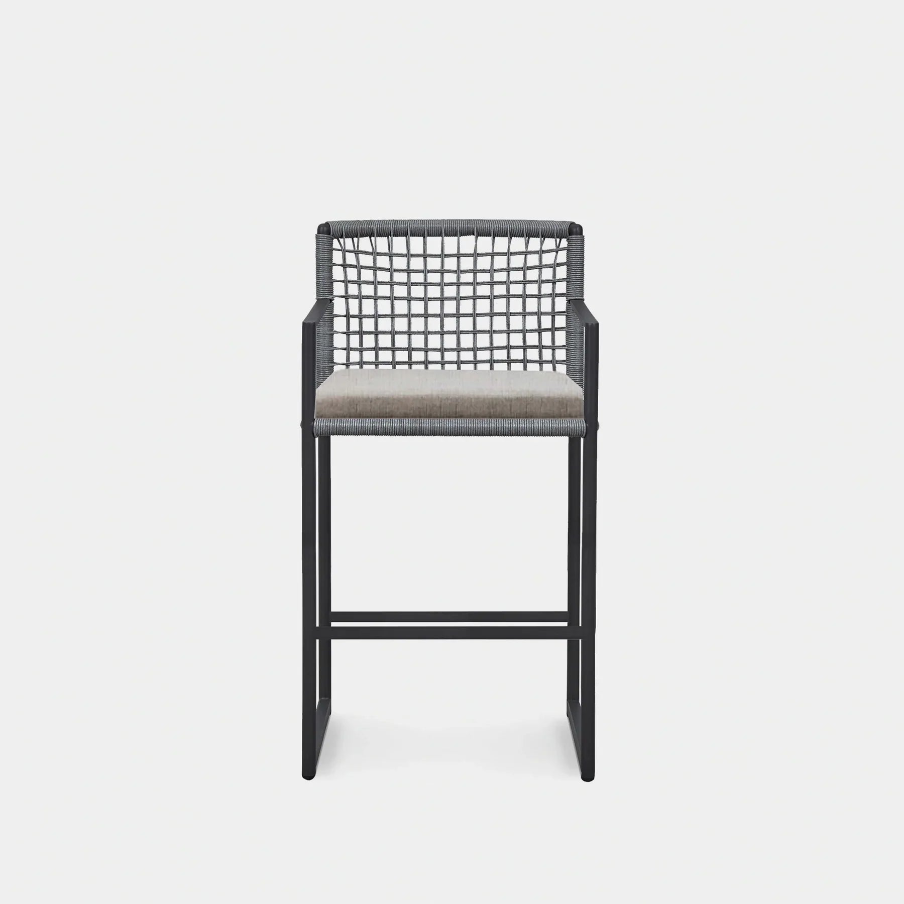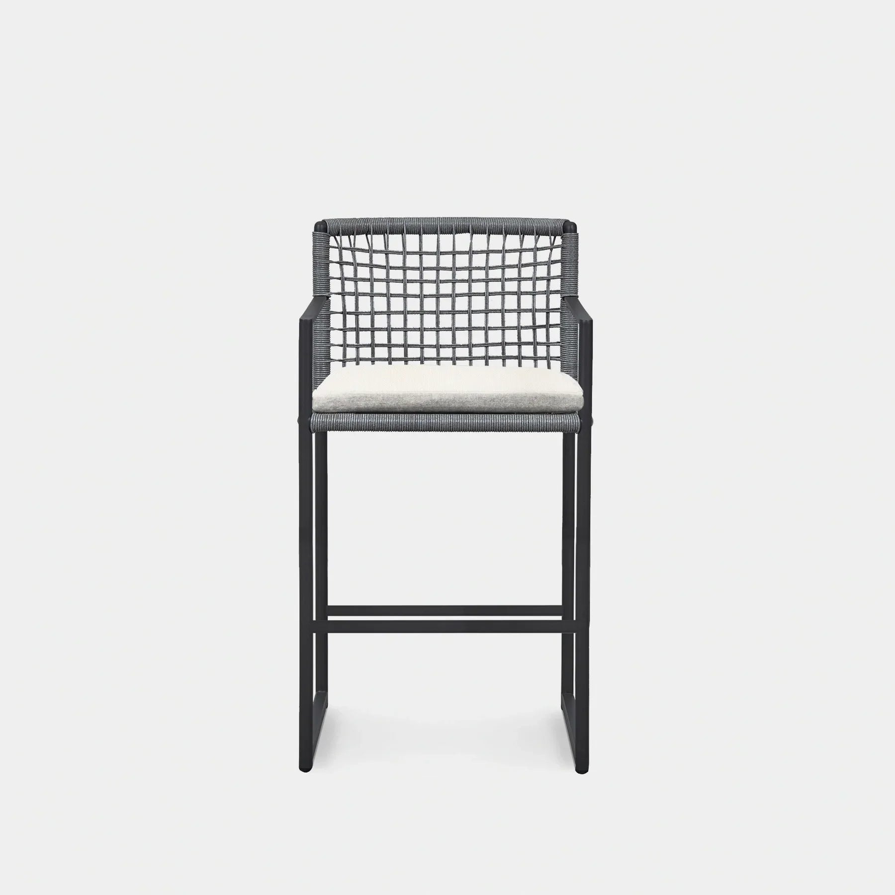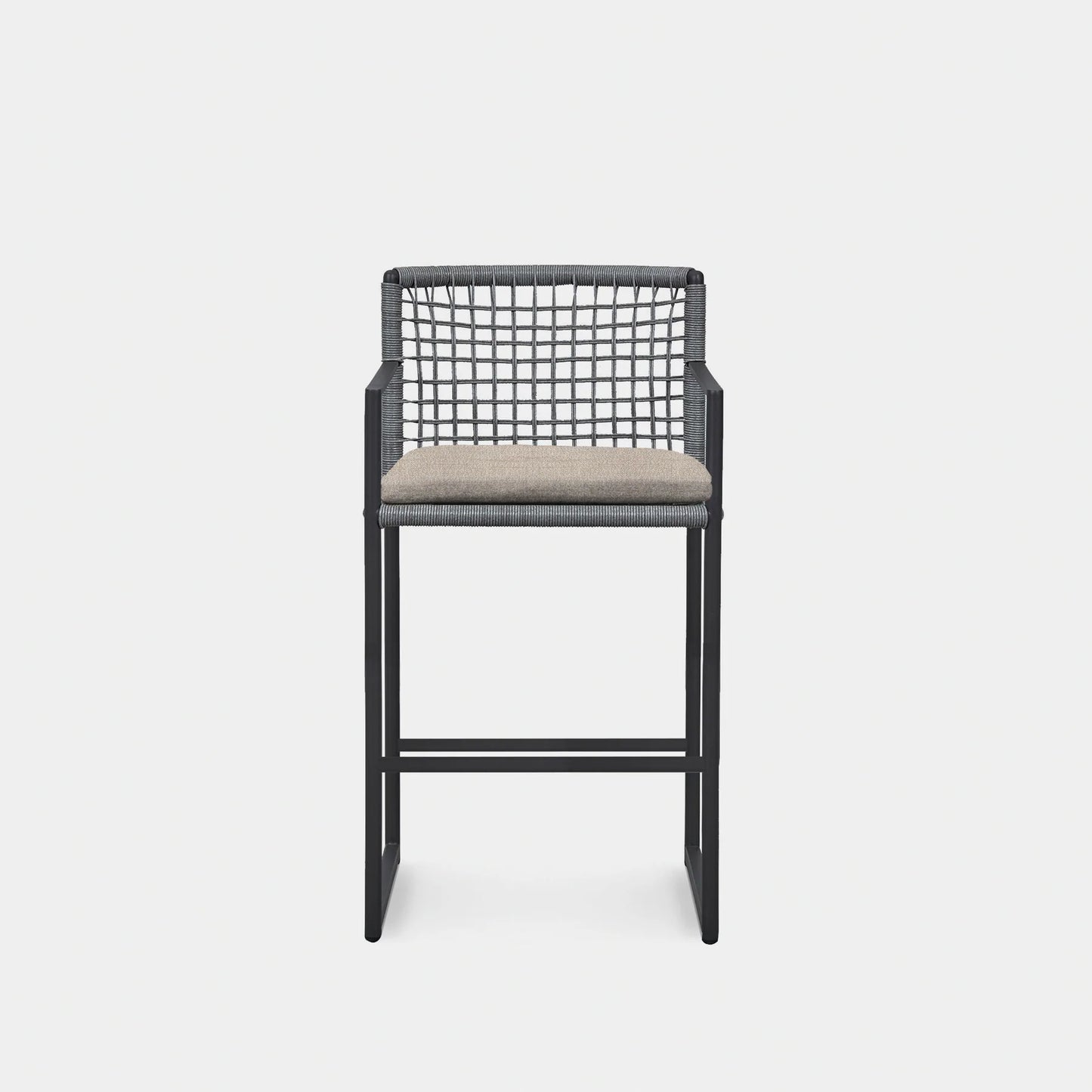 The Loop collection blends clean, angled lines with the grid of the wicker to create a namesake looping design. The Loop Counter Stool is the perfect match for your outdoor counter space — enjoy a plush cushion and a gently curved back, part of a powder-coated extruded aluminum frame. The seat and back feature an open weave all–weather wicker that balances the contemporary with the modern, with a seat cushion featuring velcro straps for a firm hold. Impeccably crafted and quick drying, this versatile piece completes any outdoor space.