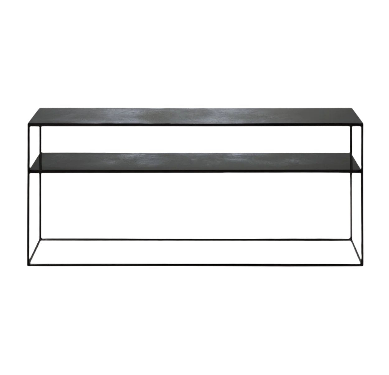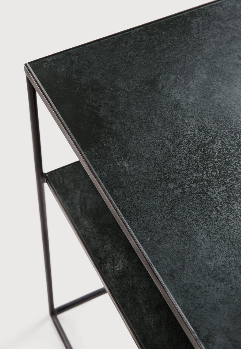 The Aged Sofa Console blends sleek, modern design with a touch of vintage elegance. Featuring a heavy aged mirror top and a minimalist black metal frame, this console is the perfect complement to your sofa, offering a stylish surface for decor or everyday essentials. Its slender design makes it a versatile piece for any living room or hallway, while the aged mirror top adds a unique character that enhances its visual appeal.