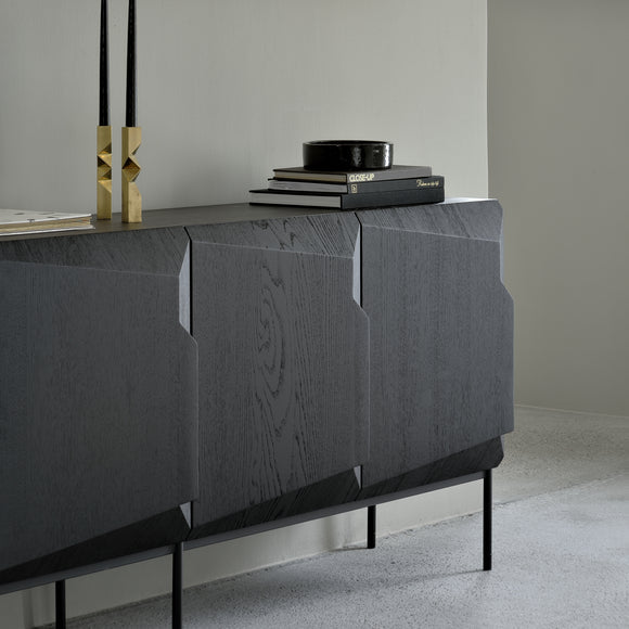 Description: The Stairs 3-Door Sideboard by Ethnicraft showcases the epitome of modern design with its sleek, angular composition and sophisticated form. Crafted from sustainably-sourced solid oak, this piece offers ample storage space behind its three doors, each outfitted with an adjustable interior shelf. The combination of black tainted oak and black metal legs adds a striking visual appeal, making it an ideal addition to any contemporary living or dining space. Perfect for storing dinnerware, electronics, or other household essentials, the Stairs 3-Door Sideboard brings both functionality and style to your home.
