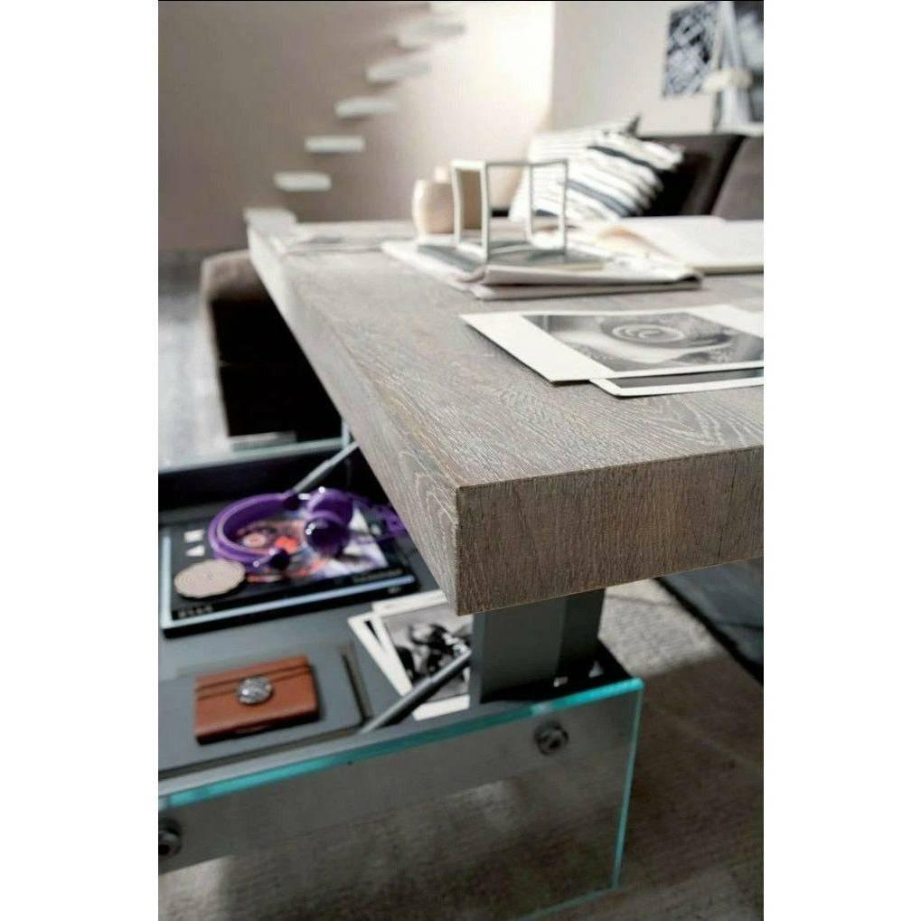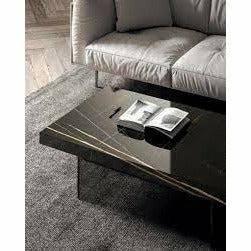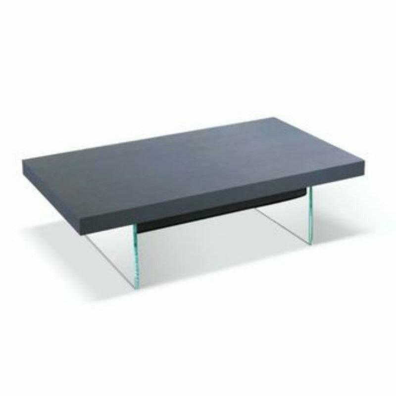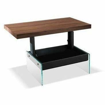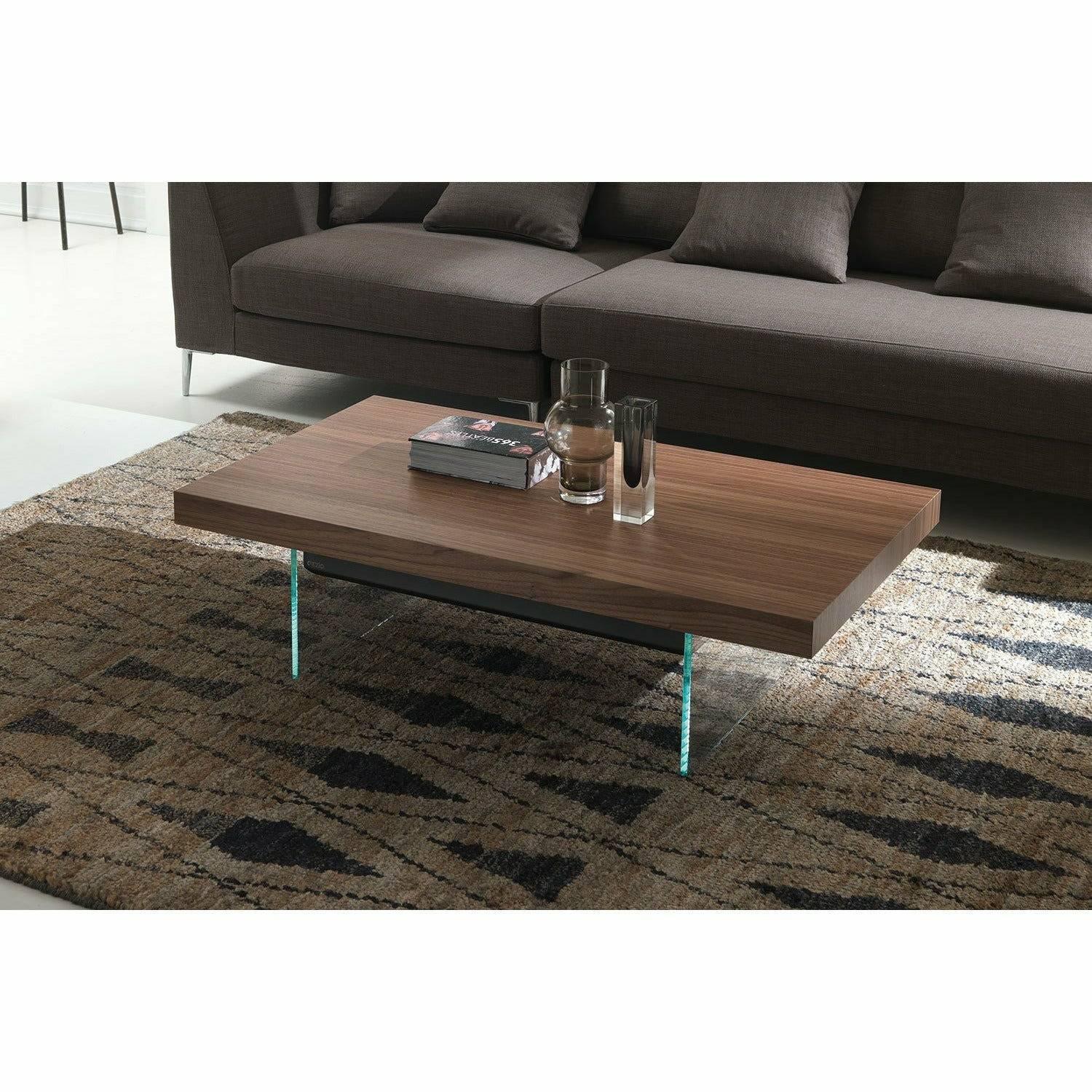 Il tavolino da caffè Ozzio Bellagio ha una struttura interna in metallo nascosta, un piano in legno e gambe sospese in vetro Starfire.