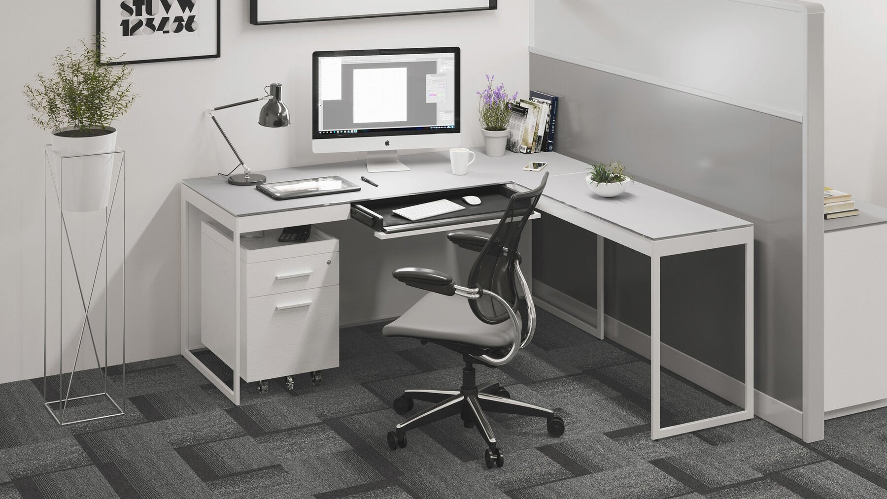 The Centro Desk 6401 by BDI serves as the centerpiece of the Centro Office Collection, offering functionality and style in equal measure. Designed by Matthew Weatherly, this desk features a sleek modern design, combining painted hardwood veneer, satin-etched tempered glass, and powder-coated steel for a contemporary aesthetic. Its innovative features include a flip-down keyboard drawer, non-slip lining, and wire management systems, ensuring a clutter-free workspace.