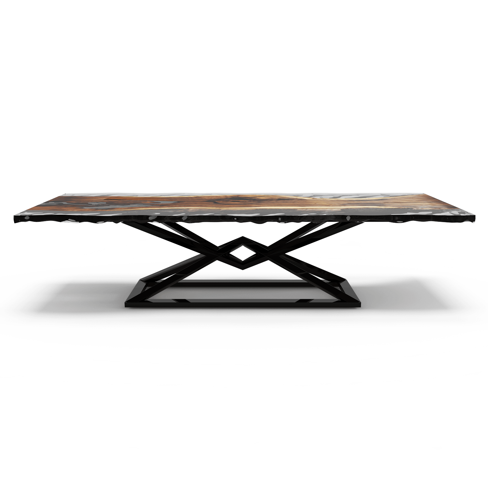 The Arditi Collection has introduced a stunning and unique Black Abruzzo Walnut Wood Wavy Dining Table that combines the natural beauty of wood with the durability of resin. The modern design of this dining table is sure to make a statement in any dining room. The combination of resin and wood creates a visually striking contrast that sets it apart from traditional wooden tables. This dining table is durable and easy to maintain and clean. The resin coating protects the wood from scratches and spills, making it perfect for daily use. With its clean lines and sleek design, this dining table from the Arditi Collection will be the focal point of any dining area. Upgrade your dining experience with the Arditi resin wood dining table today.