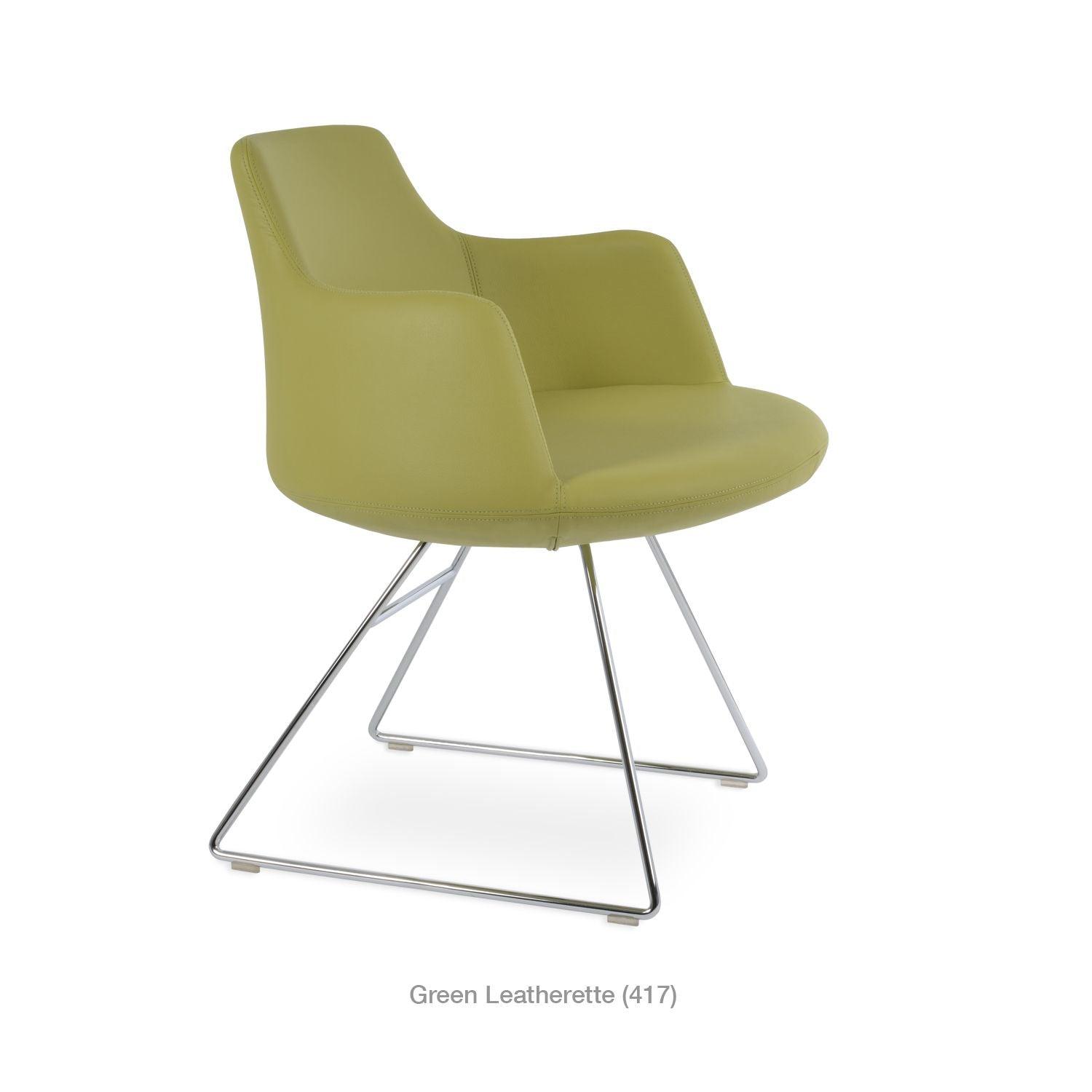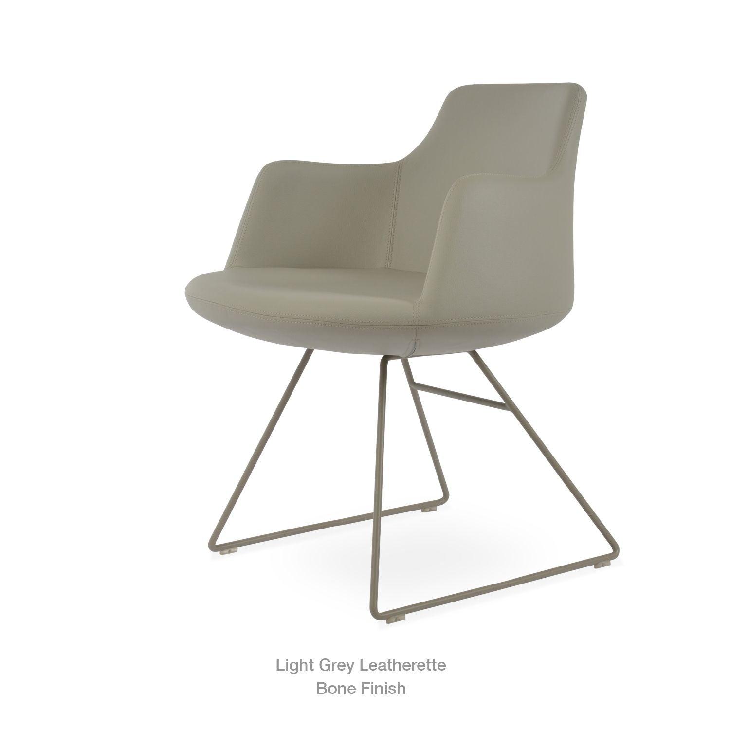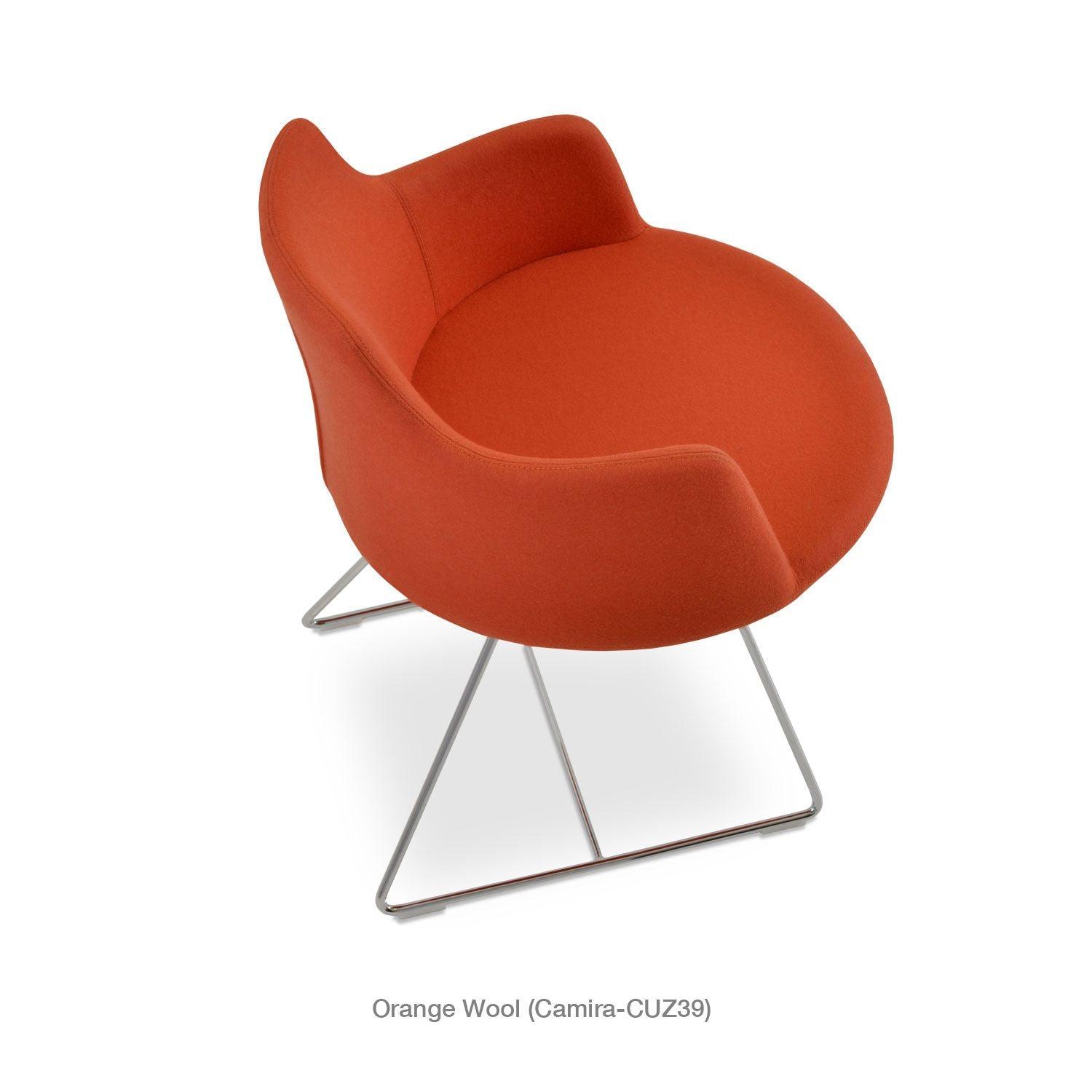 The Dervish Wire Arm Chair is a modern dining chair with an upholstered seat and backrest on a sled chrome wire base tipped with screwed plastic caps. The seat has a steel structure with “S” shape springs for extra flexibility and strength. This steel frame is molded by injecting polyurethane foam. The Dervish seat is upholstered with a removable zipper slipcover that can be changed with professional help. Camira Fabrics are five years guaranteed from the date of invoice against wear through (the complete deterioration of the fabric's structure in a particular area) and loss of colorfastness (the excessive loss of color due to exposure to light). Dervish Wire is suitable for both residential and commercial use. Dervish Wire Chair is designed by Tayfur Ozkaynak.
