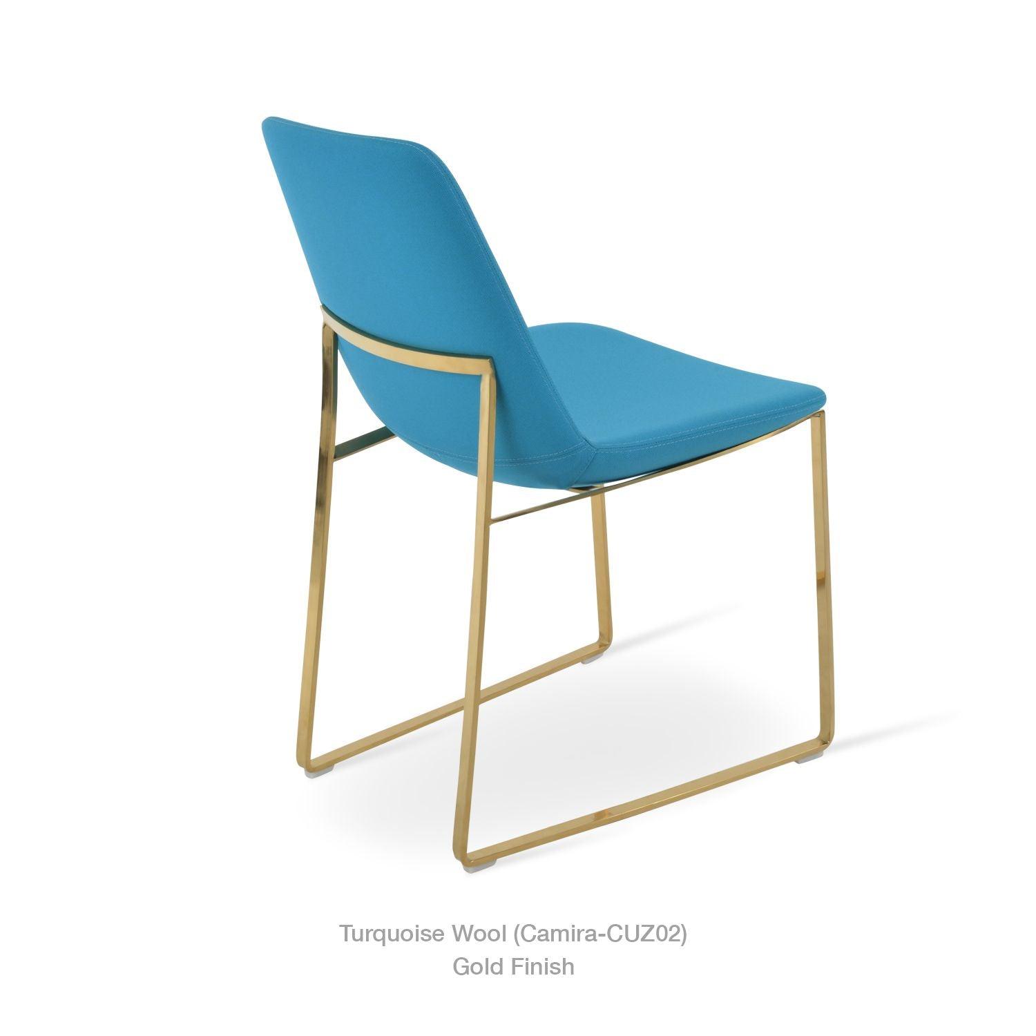 Eiffel Sled is a contemporary dining chair with a comfortable upholstered seat and backrest on a solid chrome steel sled base. Each leg is tipped with a plastic glide embedded into the metal wire. The seat has a steel structure with “S” shape springs for extra flexibility and strength. This steel frame is molded by injecting polyurethane foam. Eiffel seat is upholstered with a removable velcro, enclosed leather, PPM, leatherette, wool, and Camira organic wool slipcover. Eiffel Sled may be upholstered with various colors as a special order with a minimum quantity required. The chair is suitable for both residential and commercial use.
