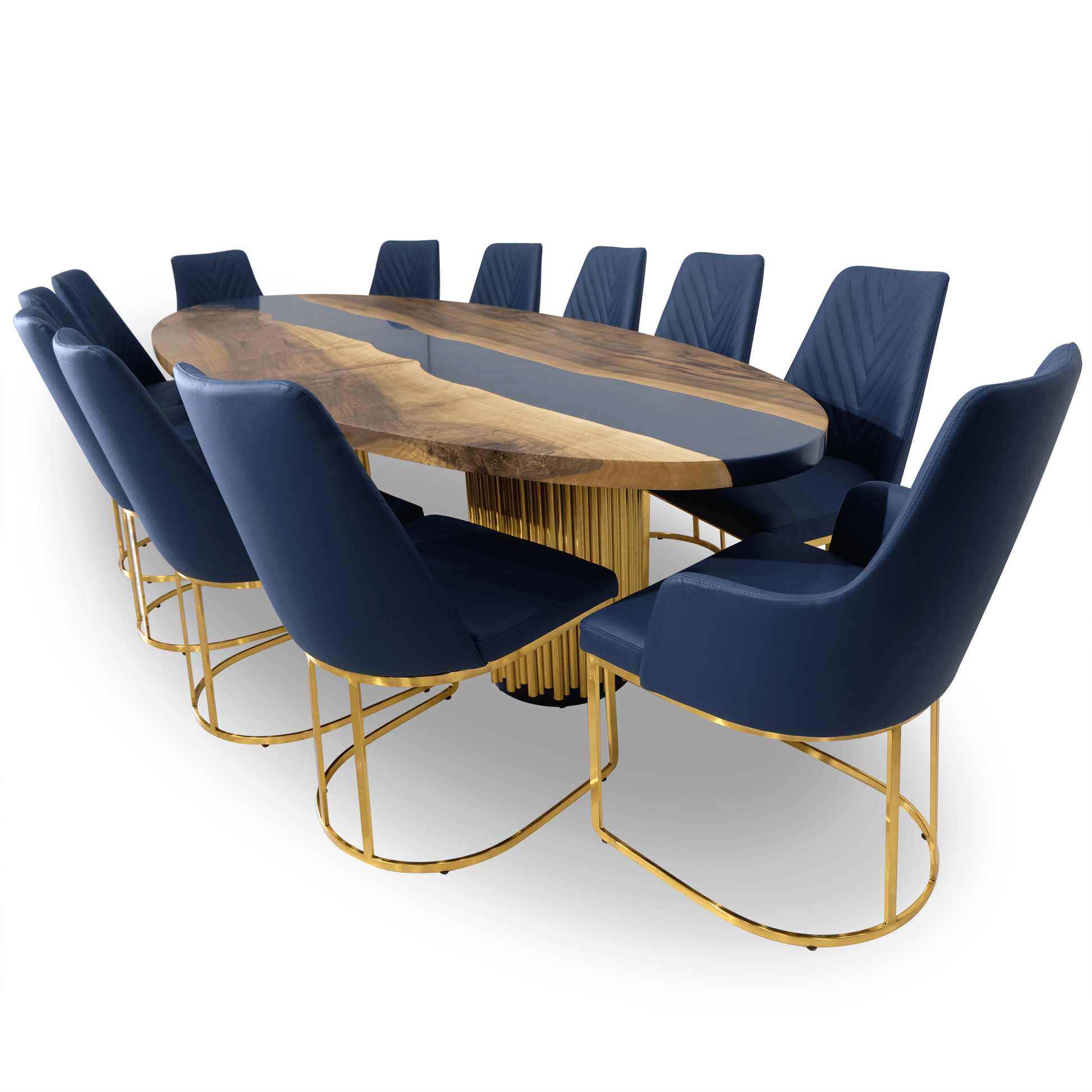 The Evohe Blue River Walnut Wood Ellipse Dining Table by the Arditi Collection is a stunning piece that will elevate any dining space. The unique blue river resin design on the tabletop perfectly complements the natural beauty of the walnut wood base, creating a striking contrast that is both modern and elegant. The table's elliptical shape provides ample space for comfortable seating and easy conversation, making it ideal for family dinners or entertaining guests.