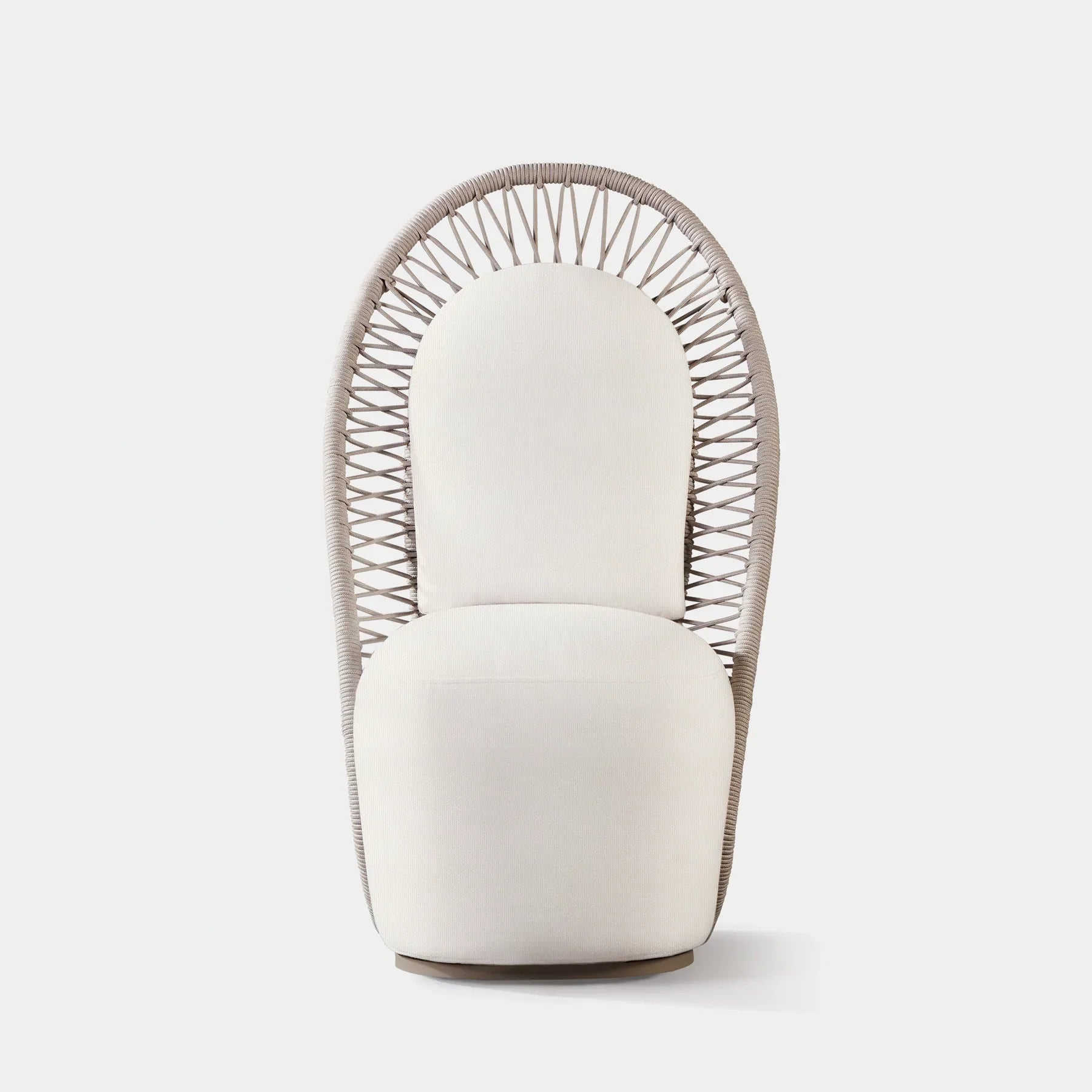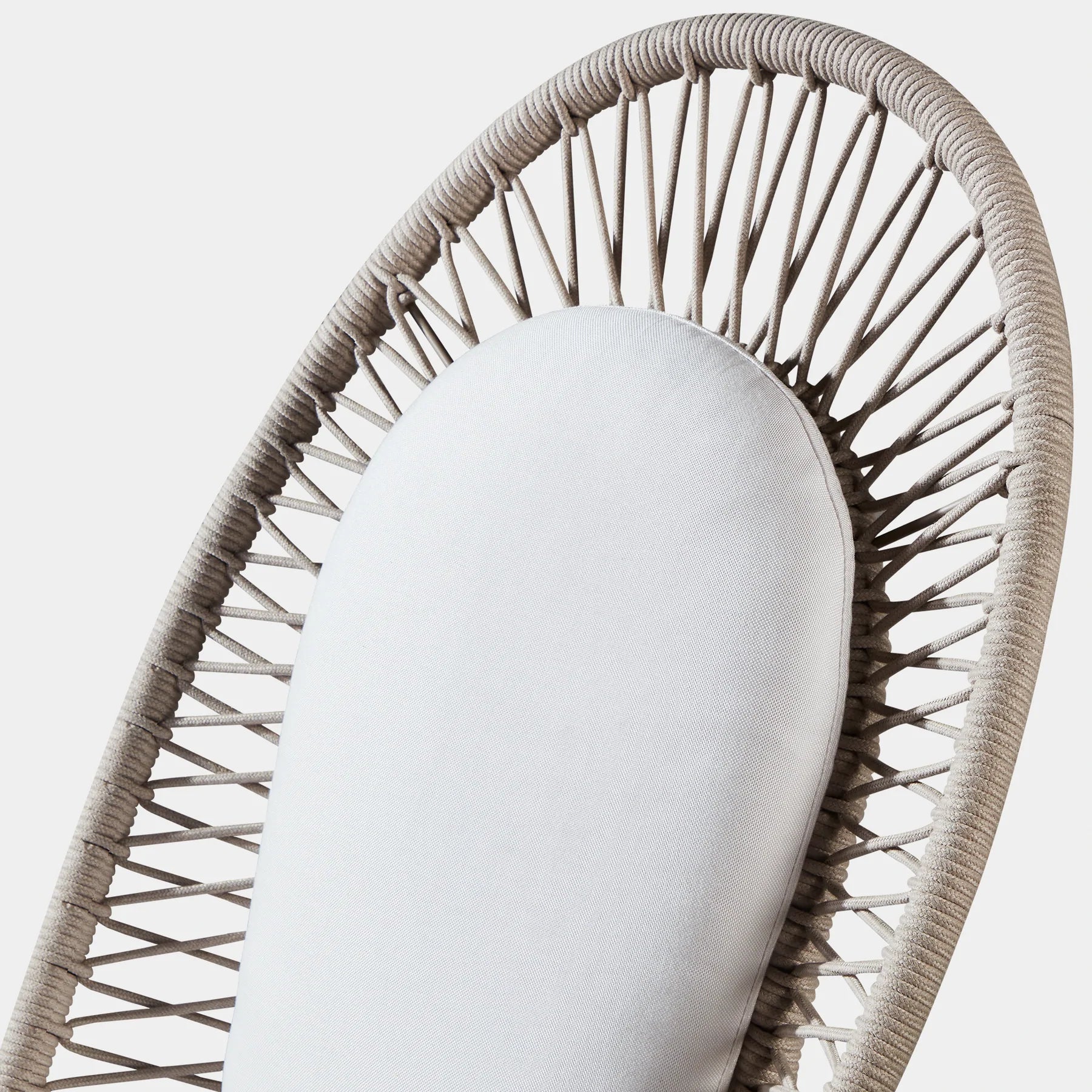 Designed by Marcel Wanders Studio. Our Maui collection is a nomadic luxury featuring a signature radial rope pattern that creates a sophisticated rhythm. Bold and design-driven, the Maui High-Back Dining Chair is a dynamic addition to your dining table — enjoy a generous seat cushion with a multi-dimensional rounded backhand woven from the all-weather taupe rope, all on a sliver of an aluminum plinth base. Refined and yet Bohemian, this conversation piece adds unexpected interest to any dining space. Use it as a head chair mixed with other Maui chairs, or use the high-back style exclusively for a tall and daring look.