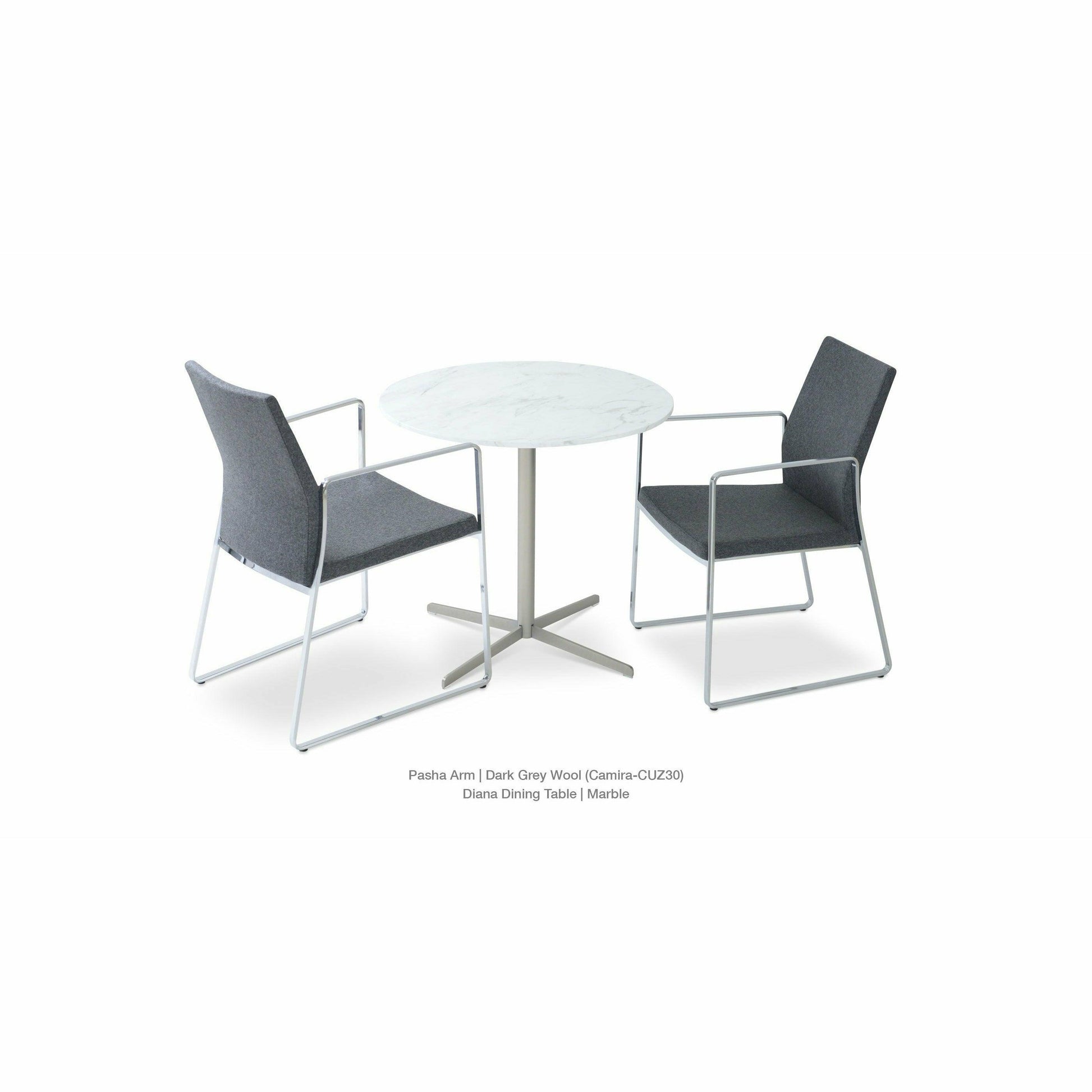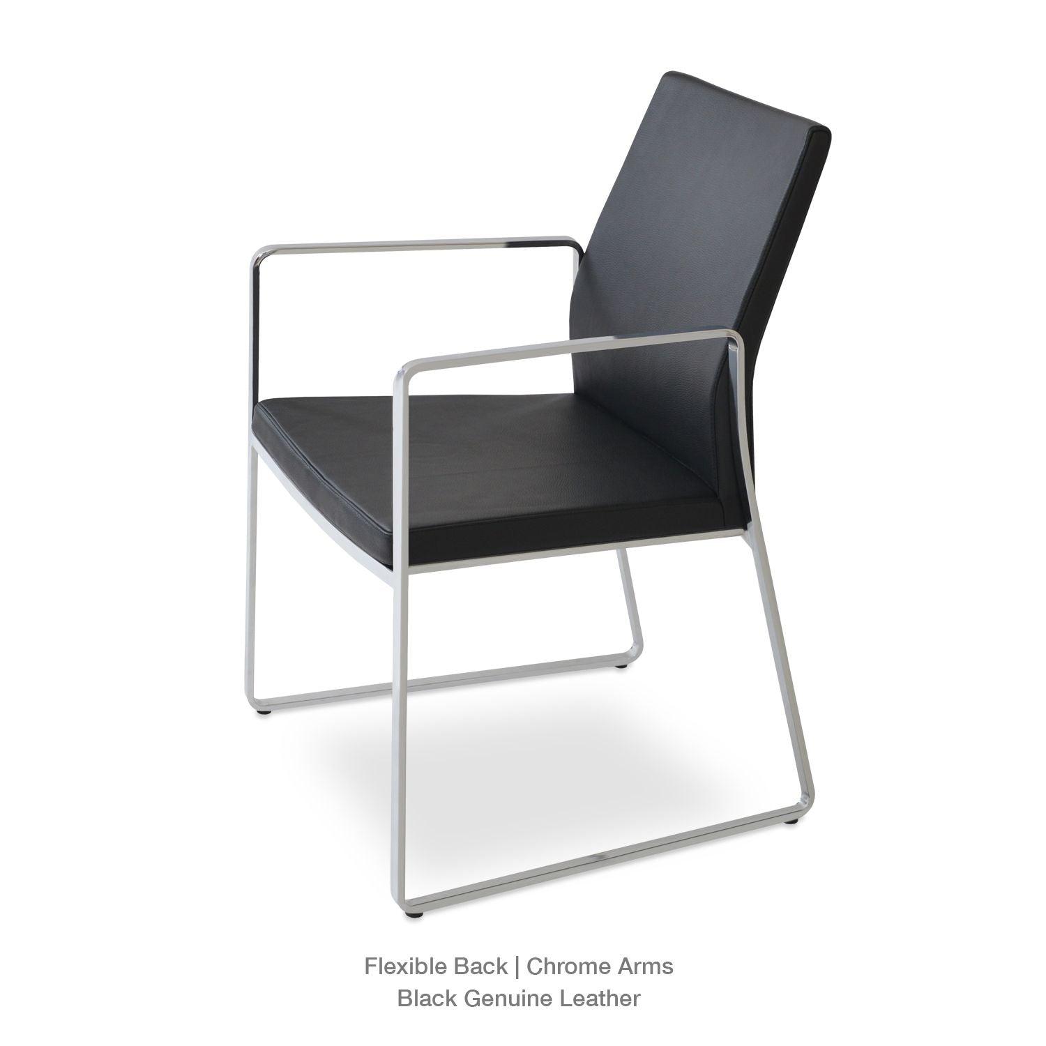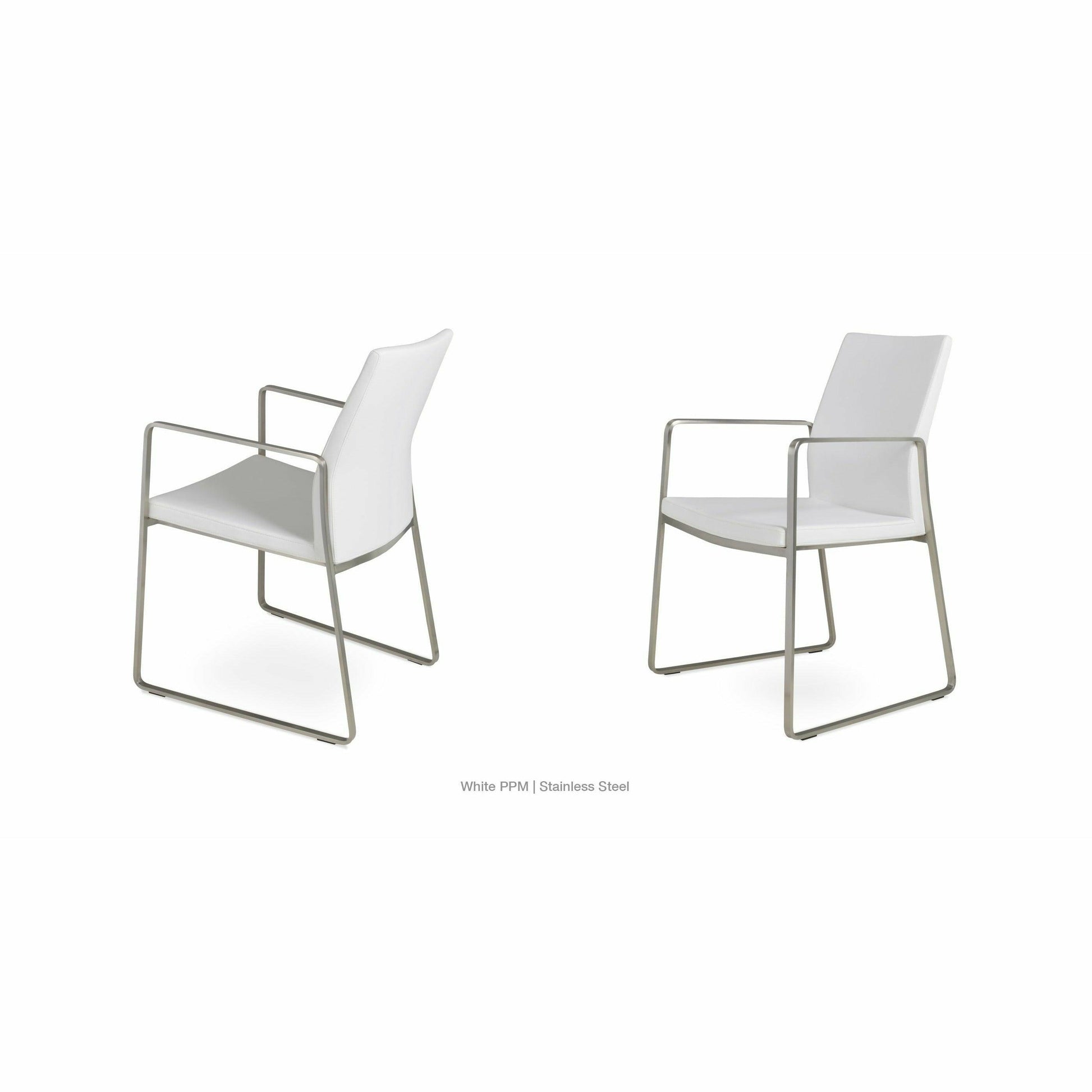 The Pasha Sled Arm Chair is an ergonomic dining chair with a comfortable upholstered seat and backrest on sled steel legs which are plastic tipped with plastic caps embedded inside the steel base. The seat has a steel structure with “S” shape springs for extra flexibility and strength. This steel frame is molded by injecting polyurethane foam. The Pasha seat is upholstered with a removable velcro-enclosed leather, PPM, or wool fabric slipcover. The arm cover displayed in the images is an option upon request; extra cost will apply. The chair is suitable for both residential and commercial use.