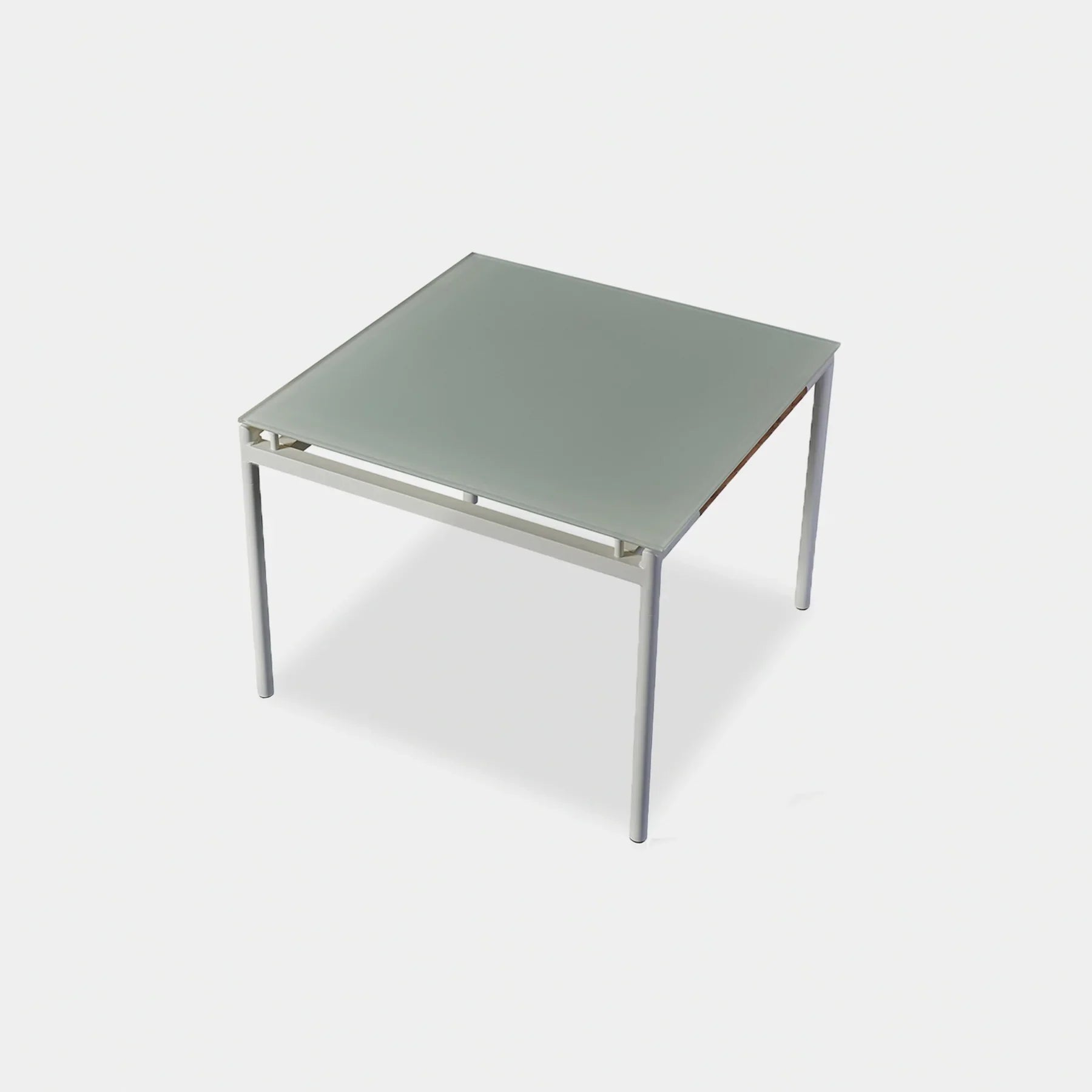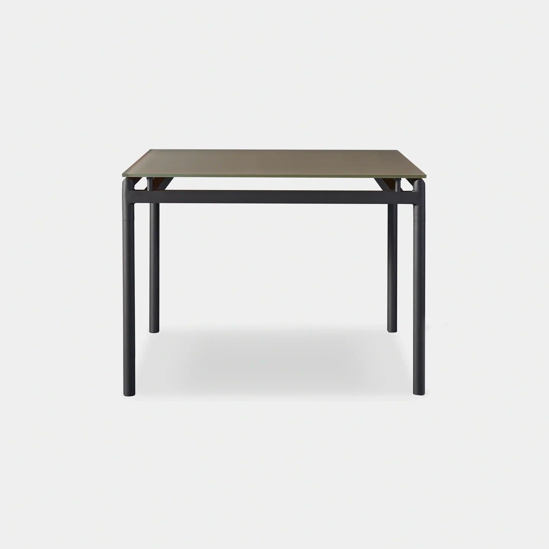 The smaller brother to our Breeze XL collection, our Breeze line mixes thin tubular aluminum construction with solid teak accents for an alluring simplicity. The Breeze Dining Table 1000 was designed as the perfect outdoor table for four — enjoy a powder coated extruded aluminum frame with teak accents in the legs and a choice of matching slatted aluminum or glass top. This square–shaped elegant piece is tailored for a variety of spaces, especially smaller ones.