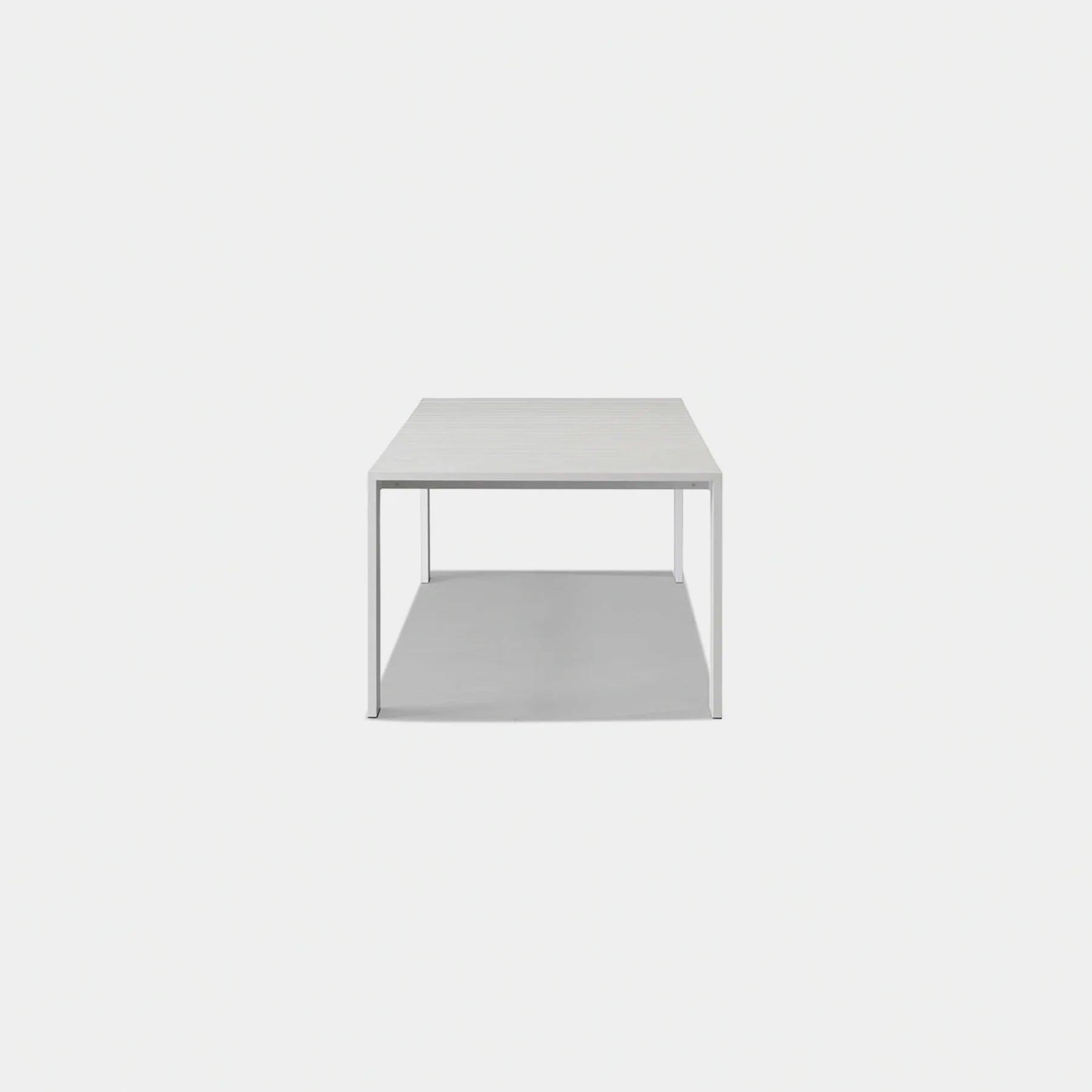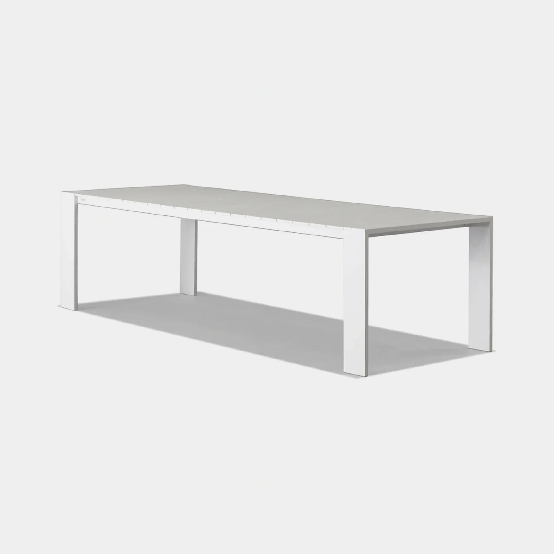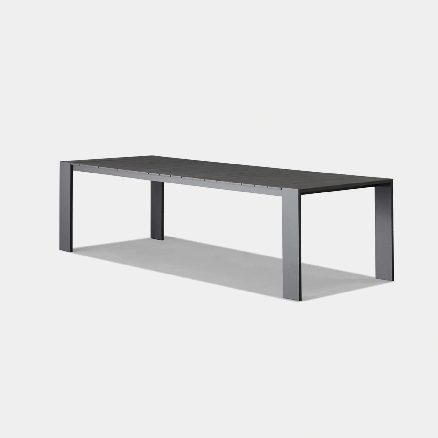 Our Hayman collection is a statement of simplicity with clean angles and modern styling. Defined by wide legs, our Hayman Dining Table 2600 was designed as the perfect outdoor table for up to ten — enjoy our standard large rectangular surface in slatted extruded aluminum that’s streamlined yet functional. An indoor aesthetic meets outdoor performance with this geometric piece made for various spaces.