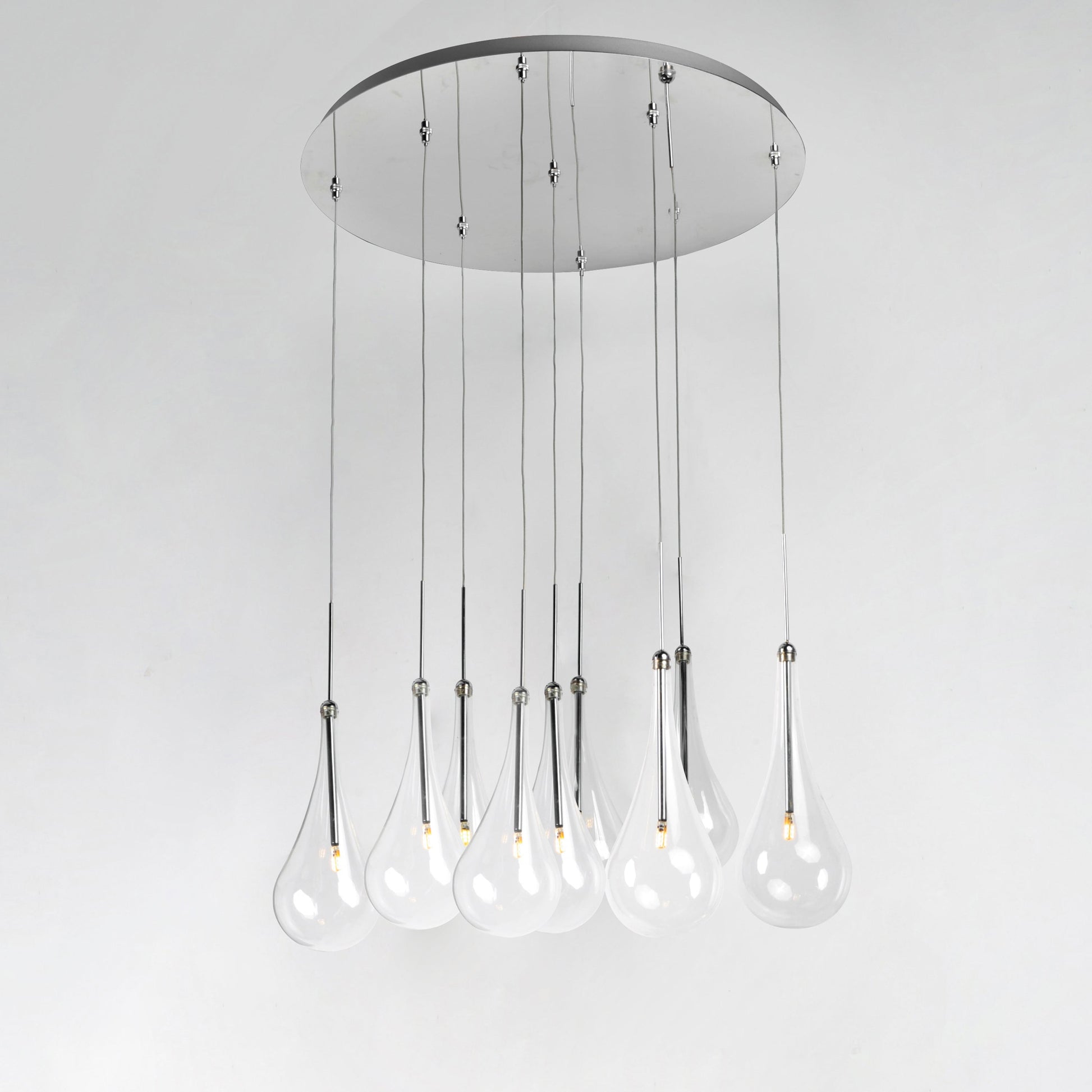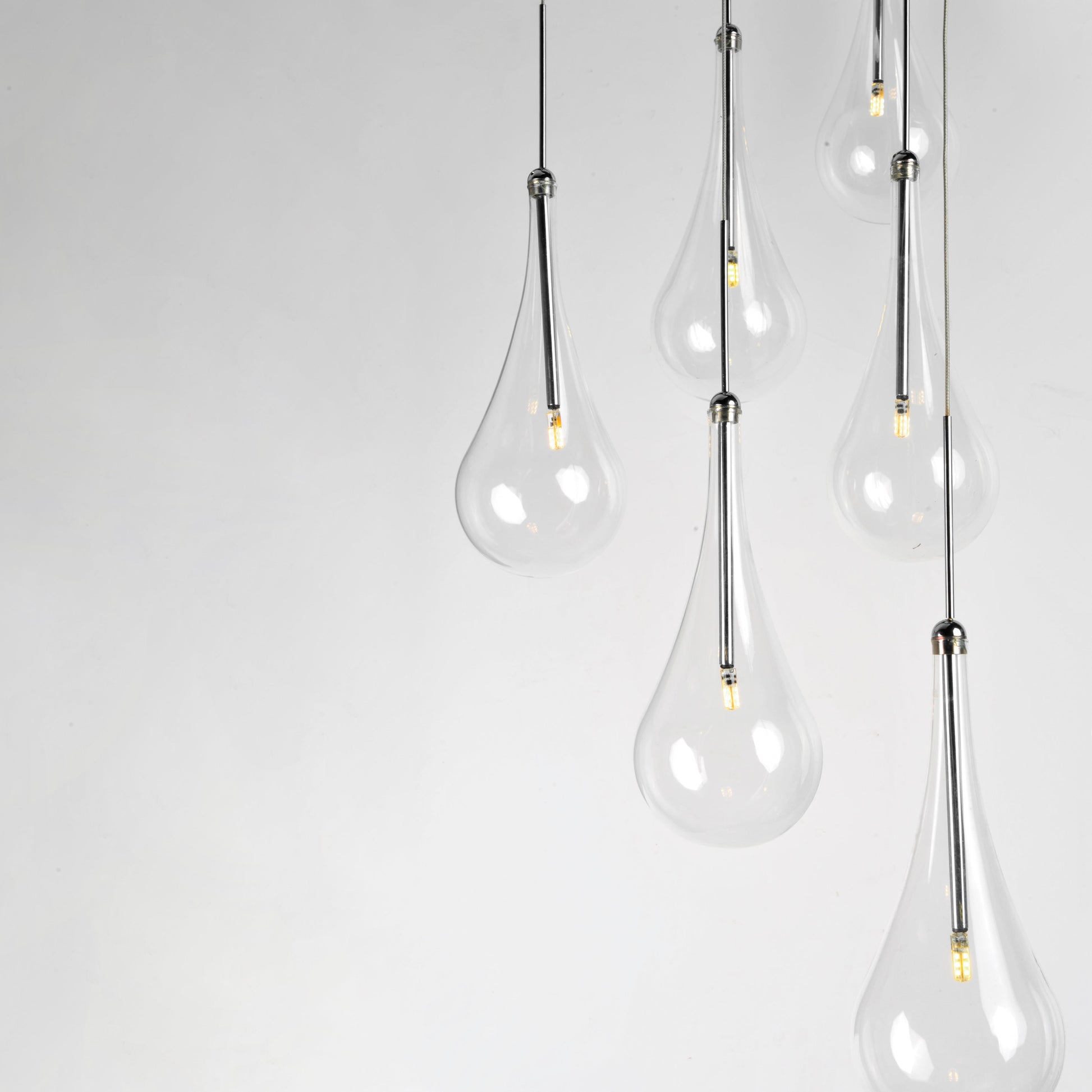 A simple idea gracefully executed in the Larmes collection. Row upon row of Clear oversized teardrops, mounted onto an extended Polished Chrome lamp holder that supports xenon lamps sets the stage. Individually adjustable drops for custom stagger effects allow for a dramatic impact. An added benefit of each drop being aircraft cable-suspended is the ability to adjust the overall height of the piece to fit the space. The final result is stark and stunning.