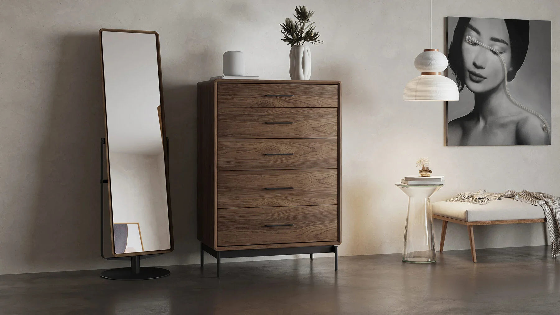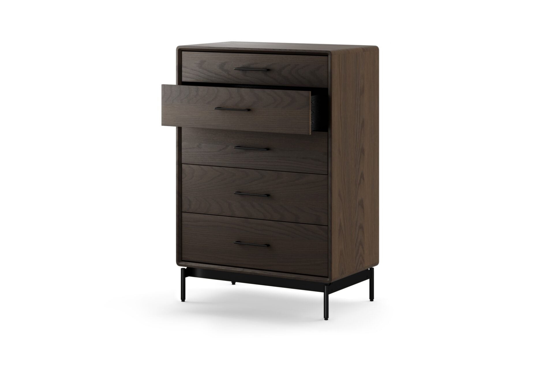 The chest is made from high-quality materials, including a steel base and a wood veneer finish, which give it a durable and long-lasting construction. The chest is available in a range of finishes, including Charcoal Stained Ash, Toasted Walnut, and Natural Walnut, allowing you to choose the one that best complements your bedroom decor.