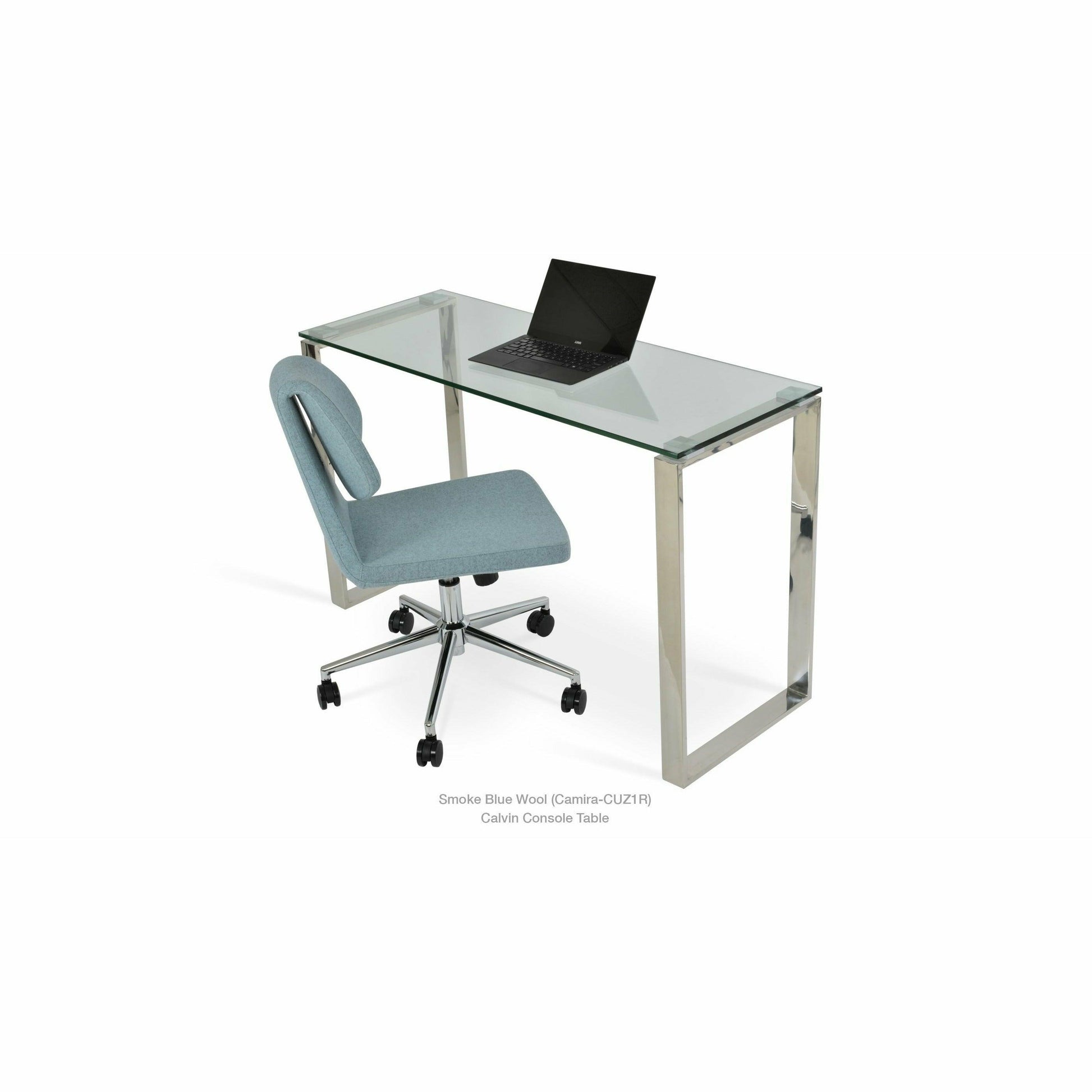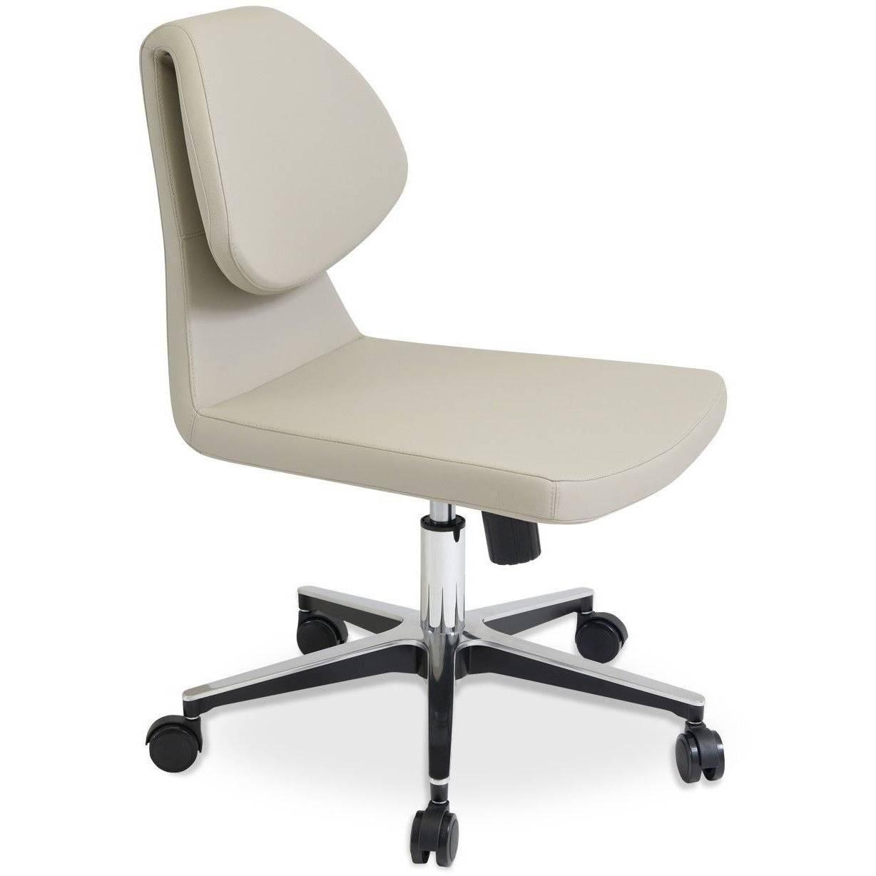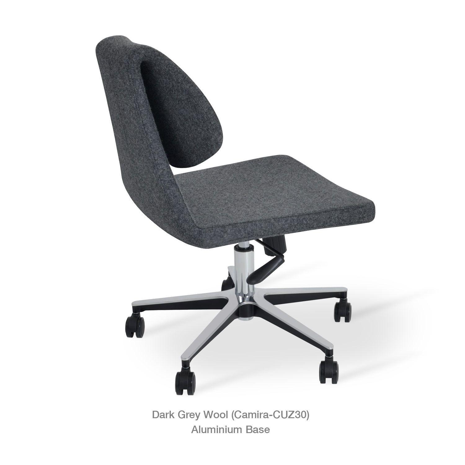The Gakko office chair is a distinctive chair with a comfortable upholstered seat and backrest on a height-adjustable gas piston base that swivels and tilts. The chair has a chromed steel five-star base with plastic casters. The folded backrest gives the chair extra comfort and a futuristic look. The Gakko Seat is built on a solid birch wood frame. Gakko's seat is upholstered with a removable zipper and velcro-enclosed top-grain leather, PPM, or wool fabric slipcover. Gakko office chair may be upholstered with various other colors as a special order with a minimum quantity requirement. The chair is suitable for both residential and commercial use.