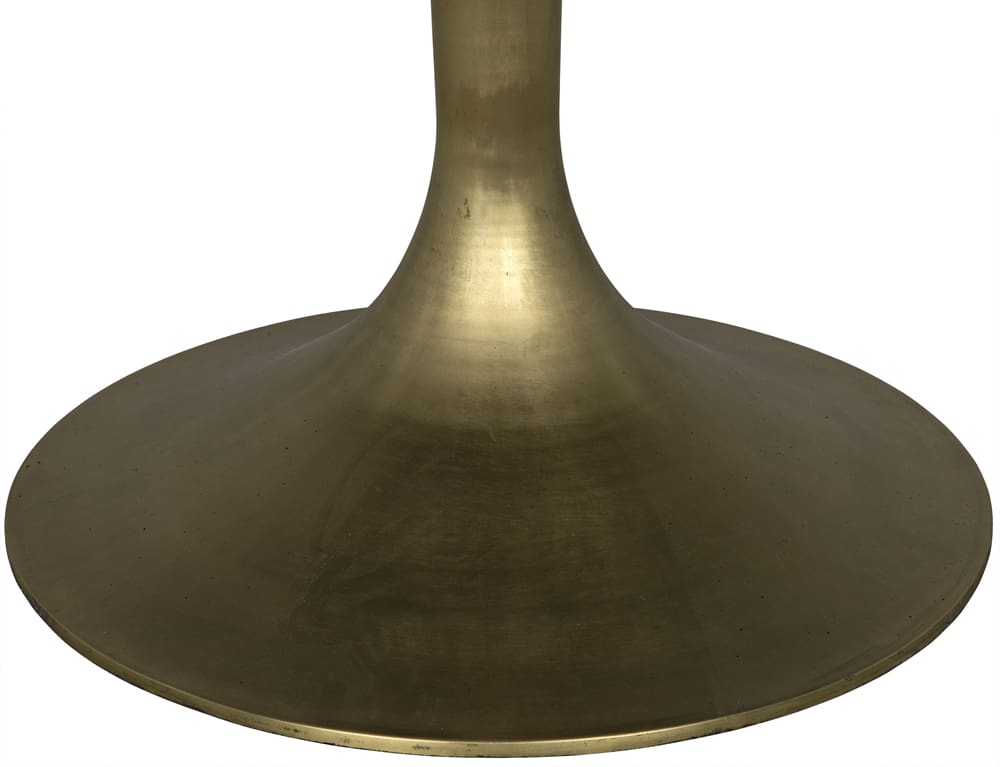 The Herno Table, 48″ by Noir, is the pinnacle of minimalist design and artisanal craftsmanship. Featuring a round steel top and a graceful pedestal base, this table blends simplicity and sophistication. Available in two striking finishes—Matte Black or Brass Finished Base—the Herno Table adds a bold yet refined statement to any dining space. Each piece is handcrafted, ensuring unique details like weld marks and tonal variations that emphasize its industrial charm.