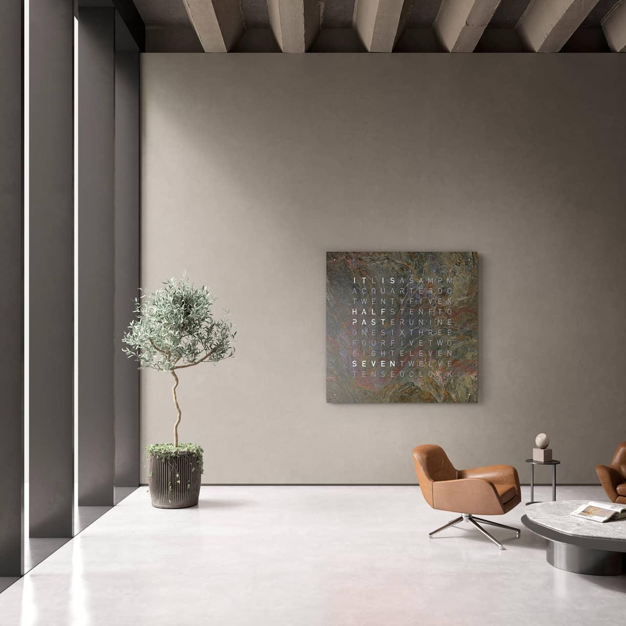 The QLOCKTWO Earth 180 reimagines traditional time-telling, transforming it into an artful display of time. This elegant timepiece uses a matrix of letters to display time in written words, making it both a functional clock and a unique piece of modern art.