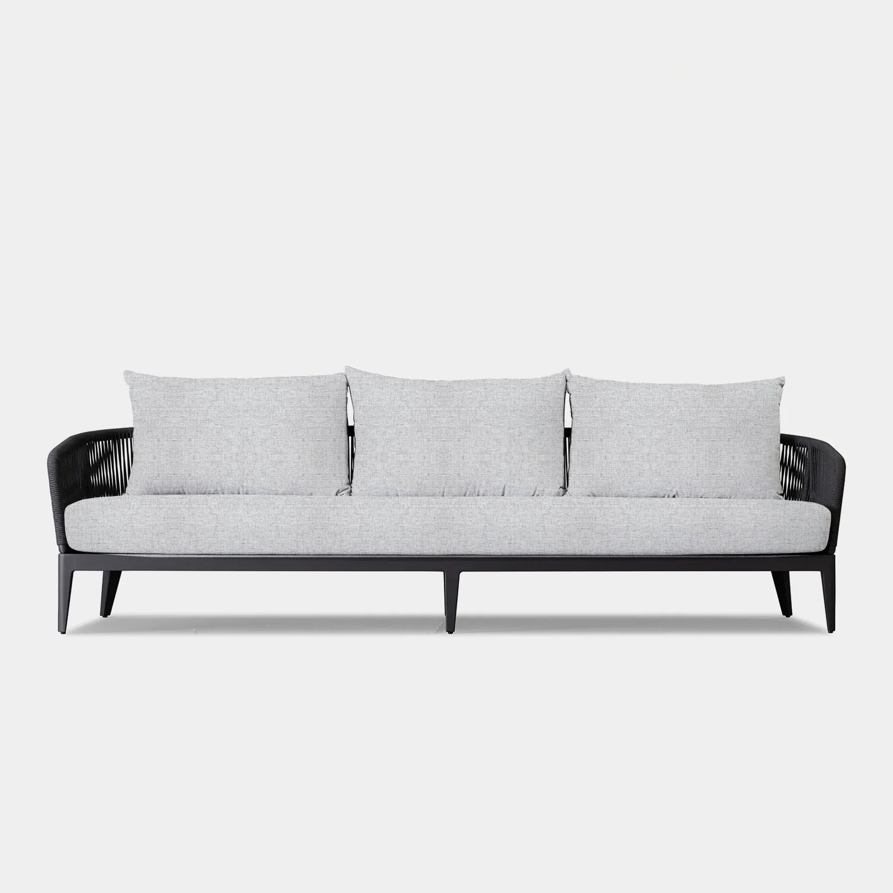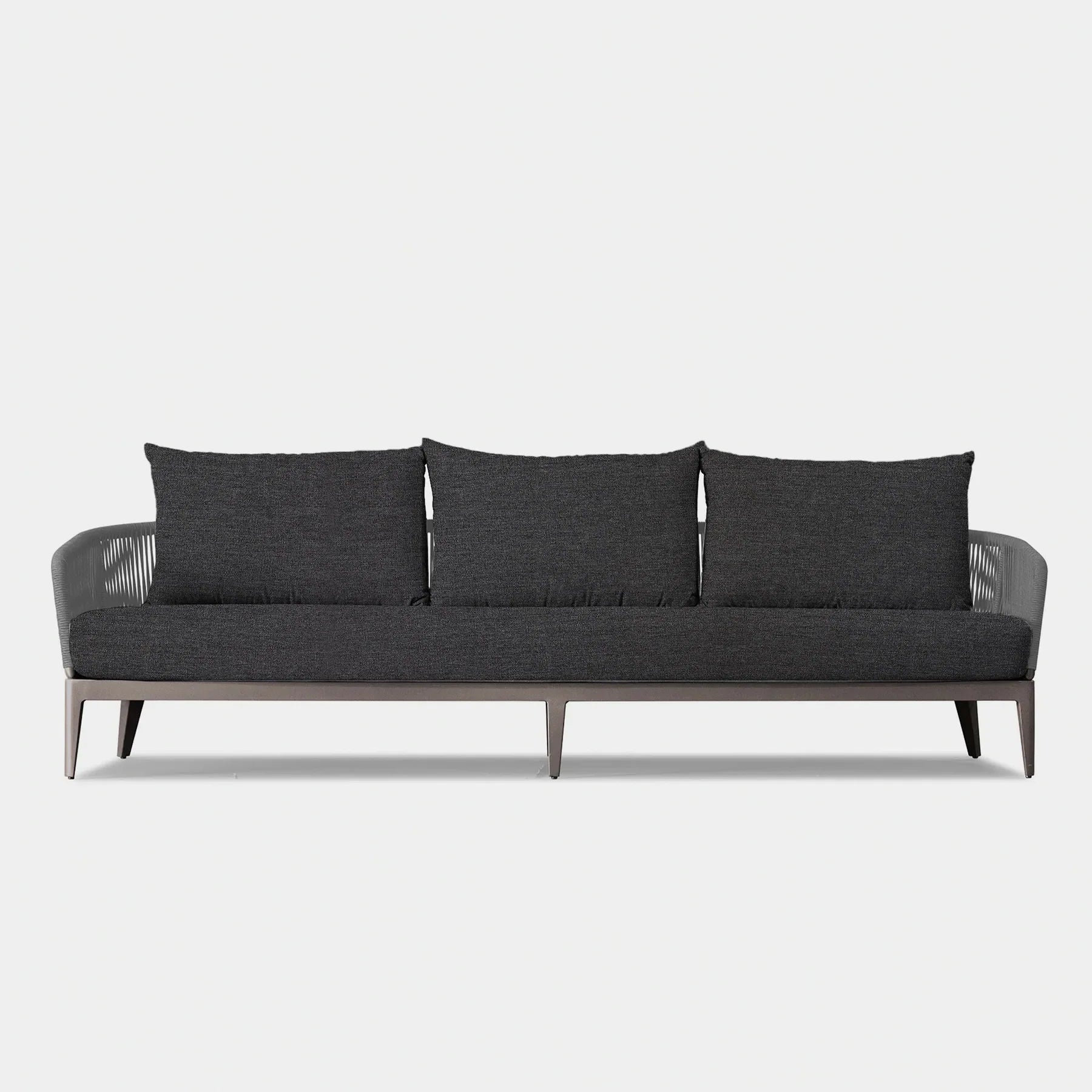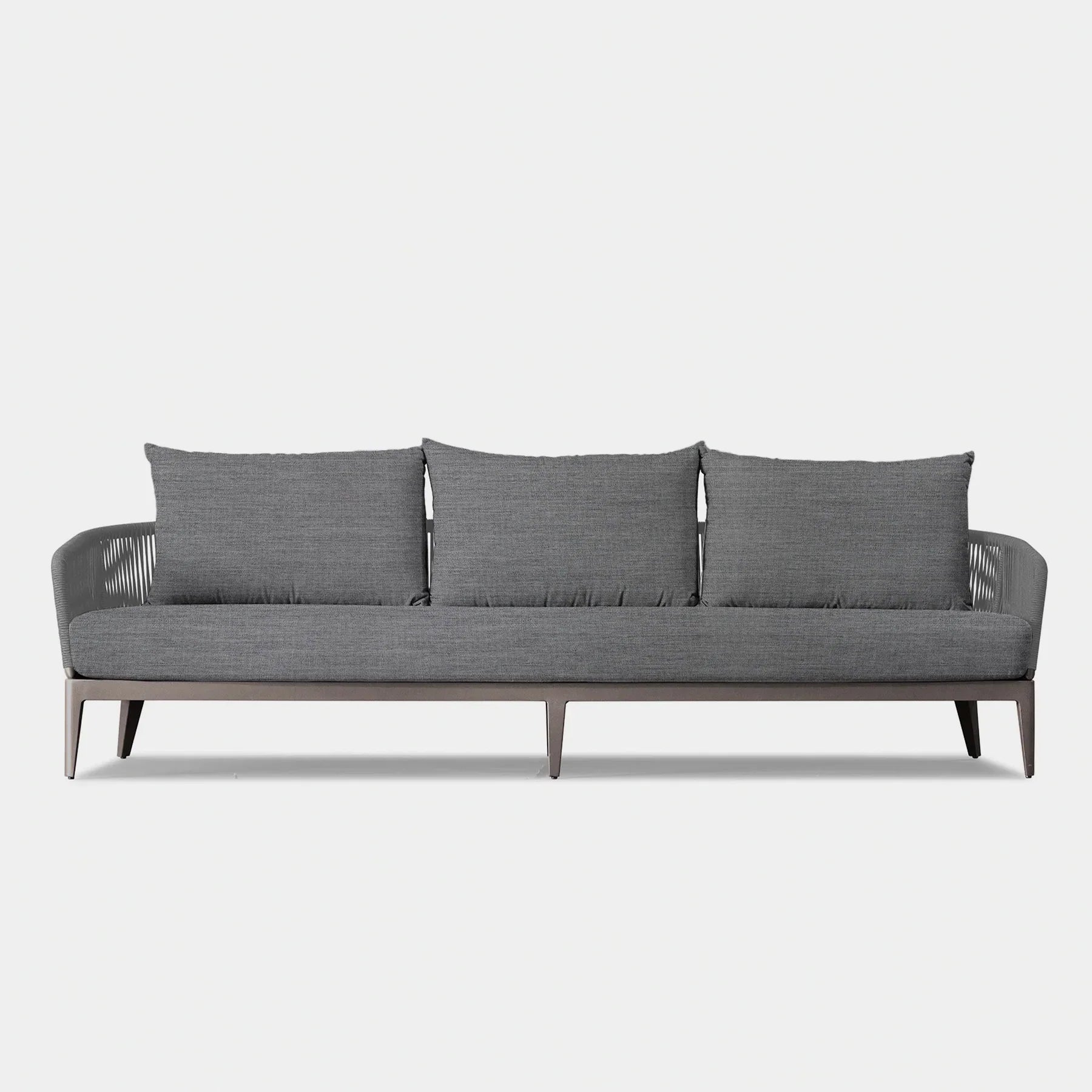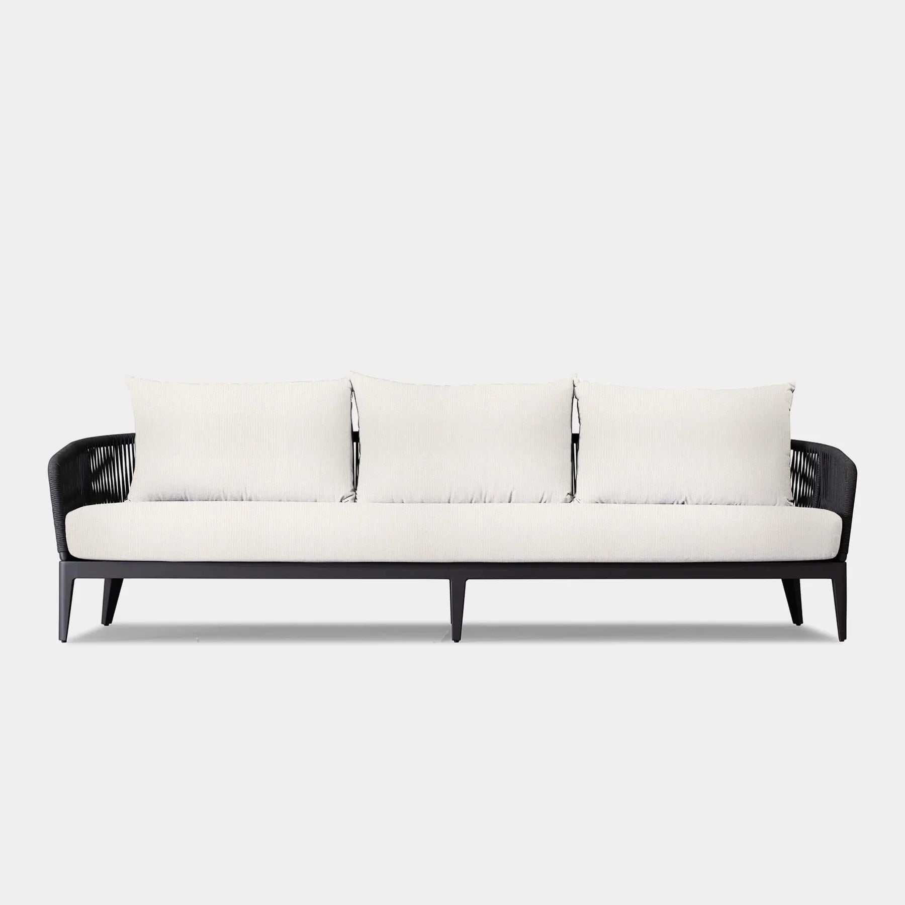 The  Hamilton collection pairs clean lines with practical design. The Hamilton 3 Seat Sofa is contemporary comfort — featuring an extruded aluminum frame with tapered legs, sculptural backrest contours, and double–layered woven Olefin rope accents. Enjoy a plush all-weather bench cushion with a knife–edge back cushions for total comfort. This effortless piece is made to be incredibly versatile, elevating any smaller space.