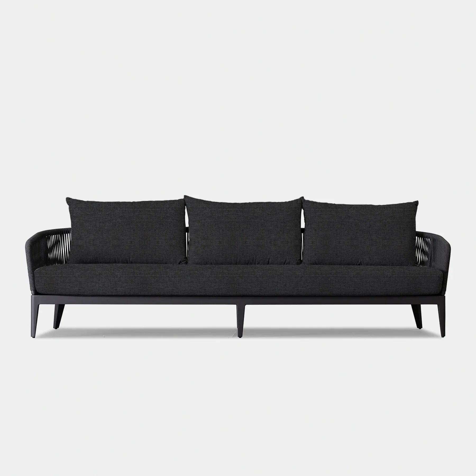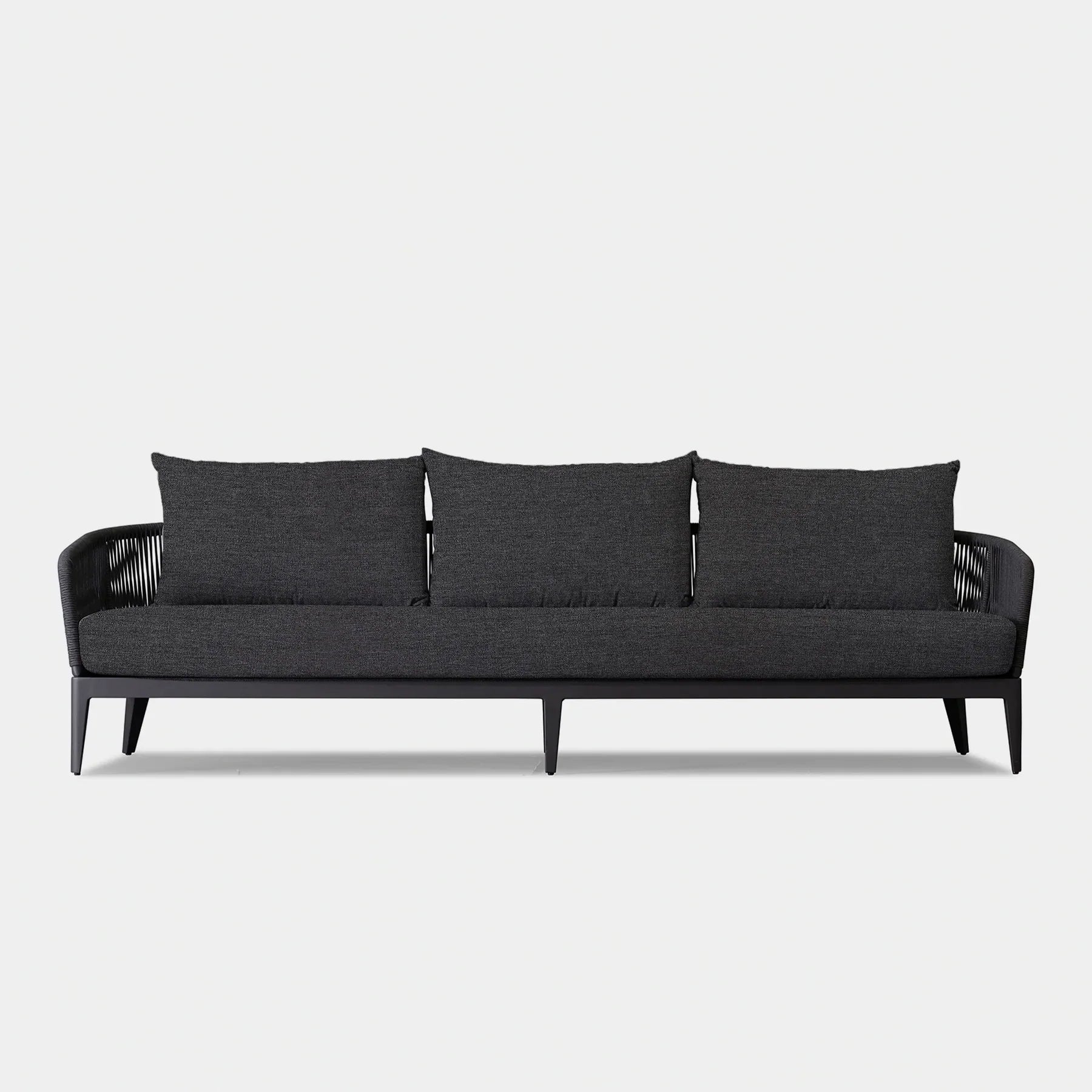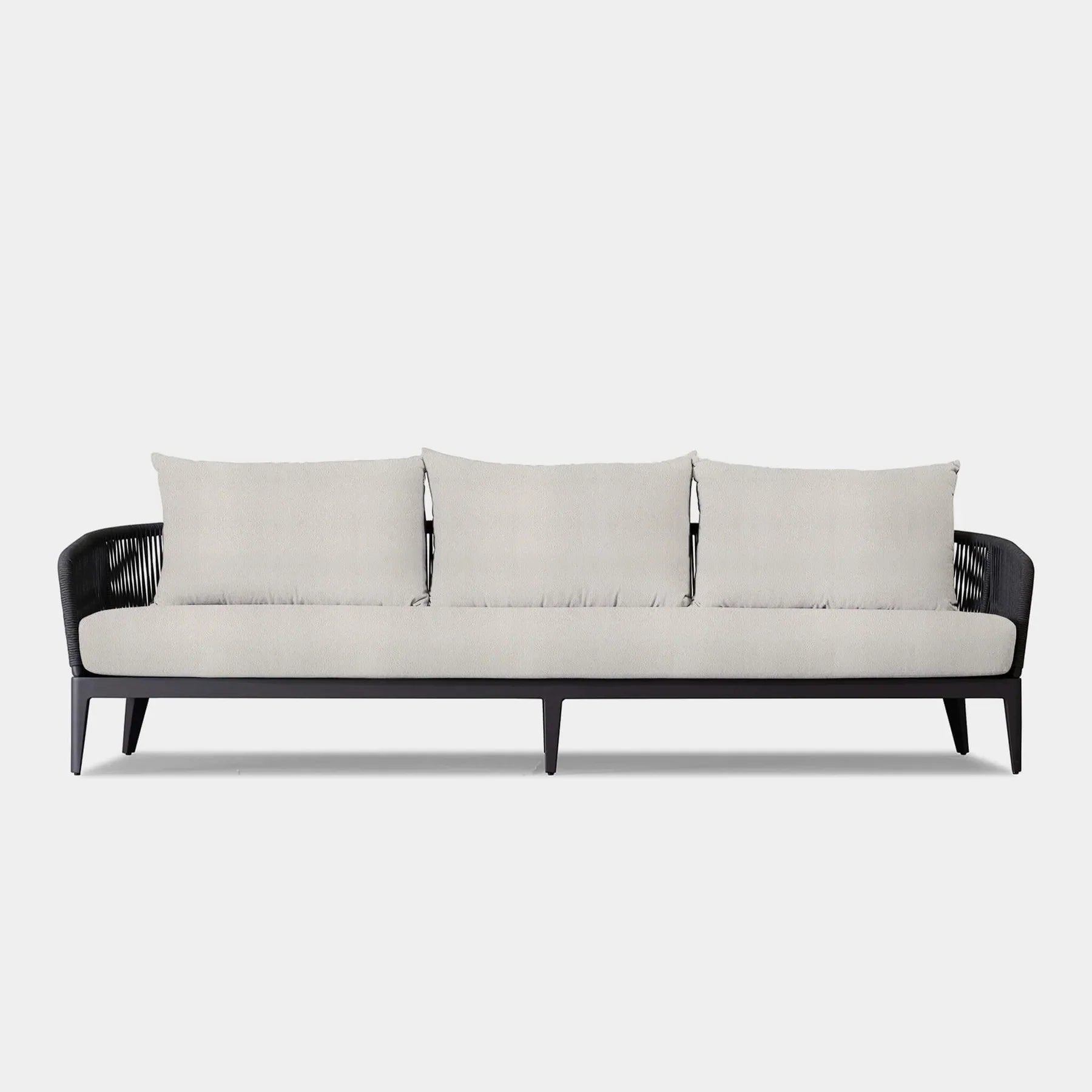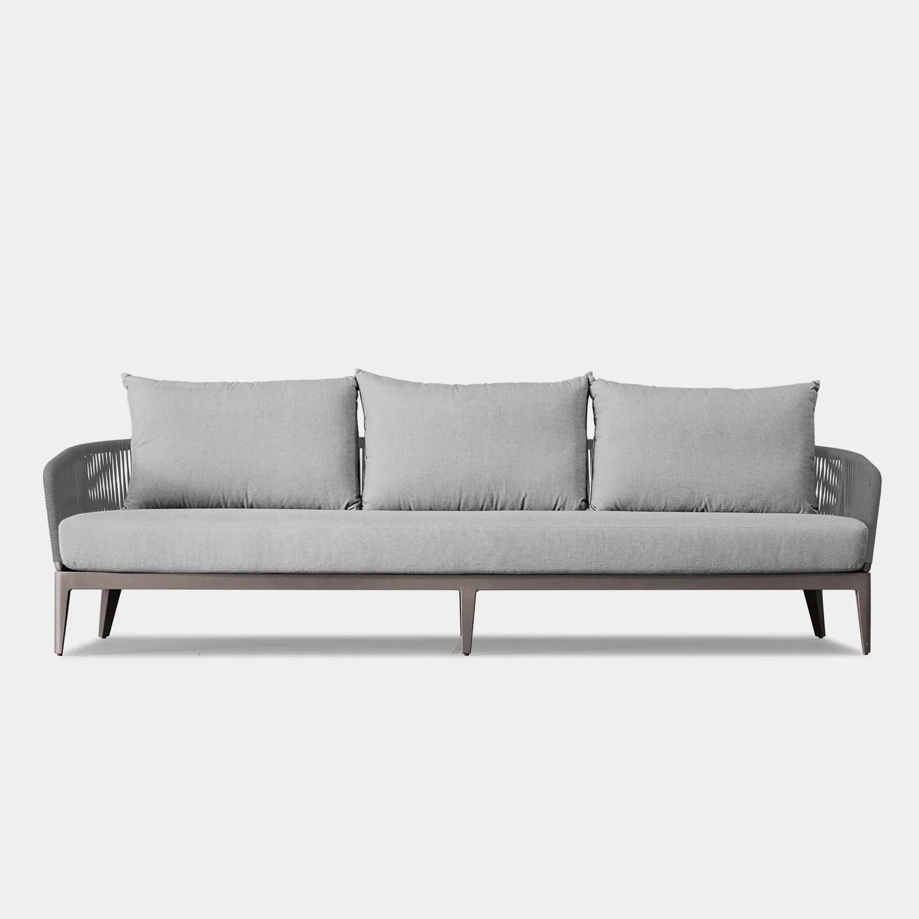 The  Hamilton collection pairs clean lines with practical design. The Hamilton 3 Seat Sofa is contemporary comfort — featuring an extruded aluminum frame with tapered legs, sculptural backrest contours, and double–layered woven Olefin rope accents. Enjoy a plush all-weather bench cushion with a knife–edge back cushions for total comfort. This effortless piece is made to be incredibly versatile, elevating any smaller space.