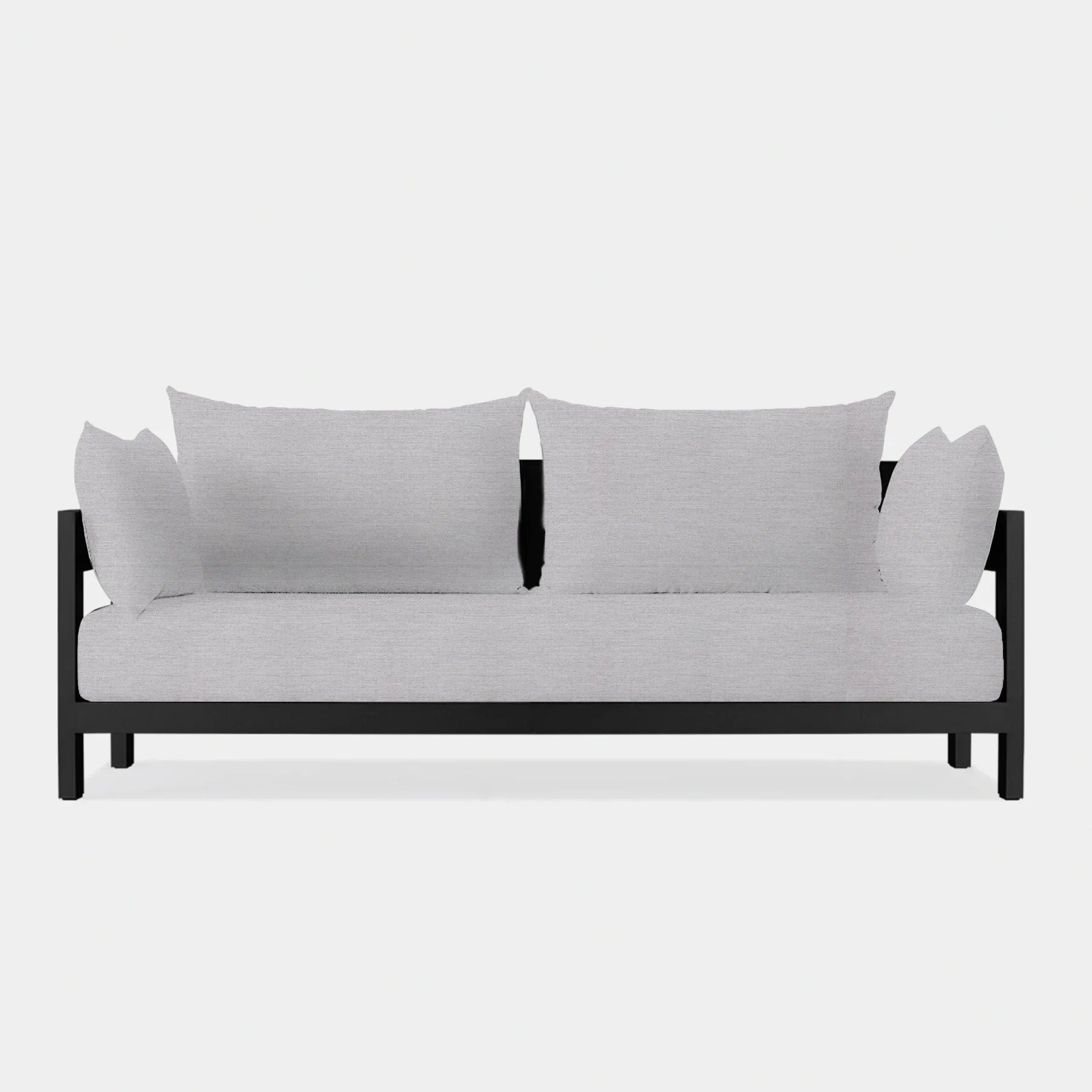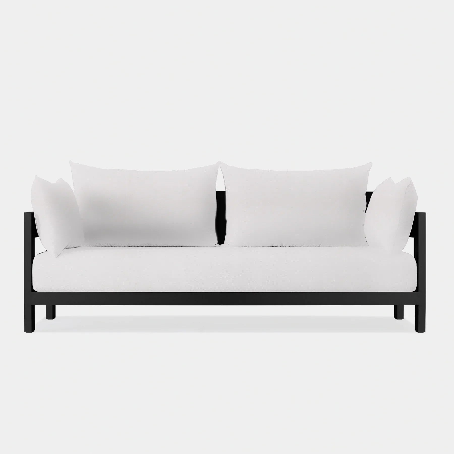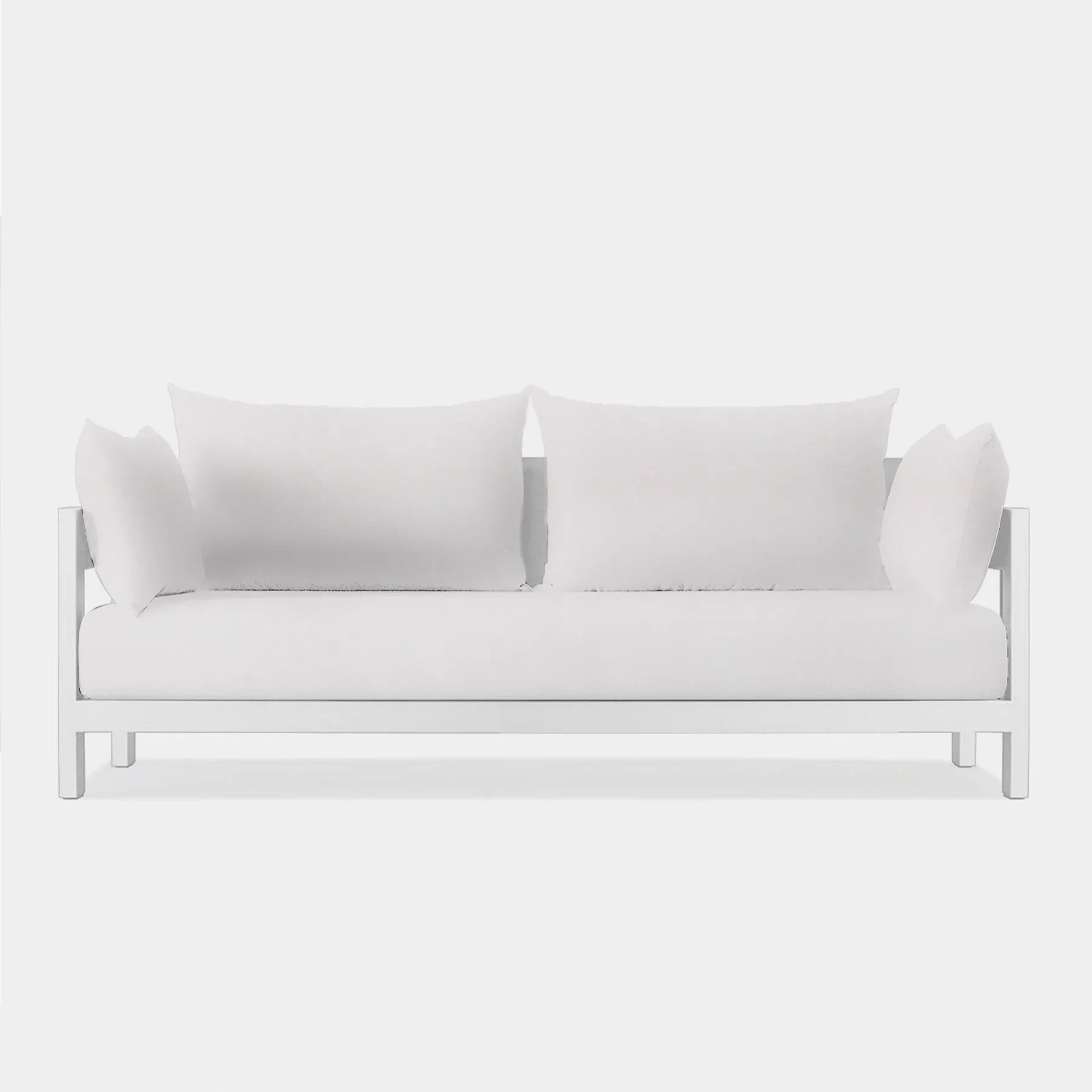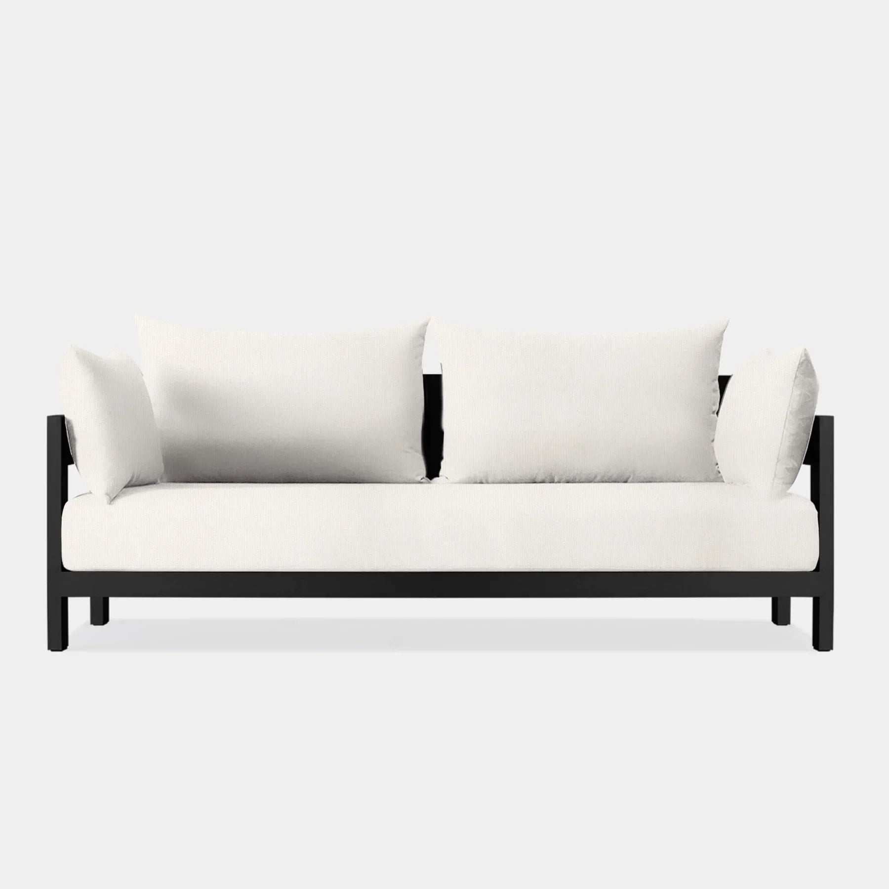 Our Hampton collection layers exciting angles with the simplicity of form for a harmonious design. The Hampton 2 Seat Sofa is an elegant update to timeless pieces — enjoy a plush bench cushion on a sling suspension, all handcrafted in square geometries of extruded aluminum. Side cushions add extra comfort, while square cut–out details add visual interest. Clean lines and versatility make this piece perfect for any smaller outdoor space.
