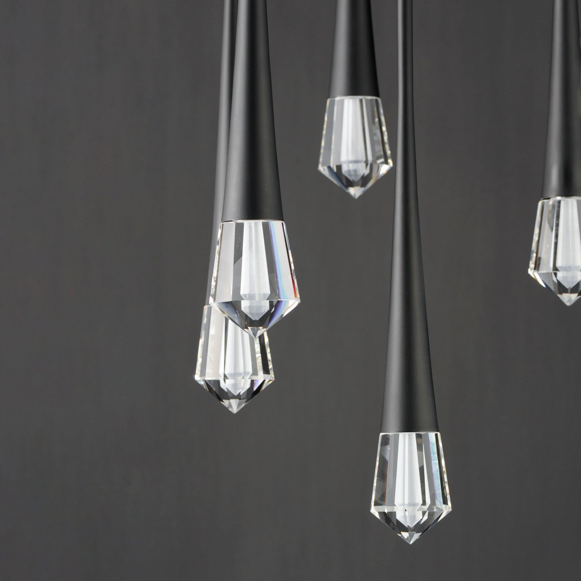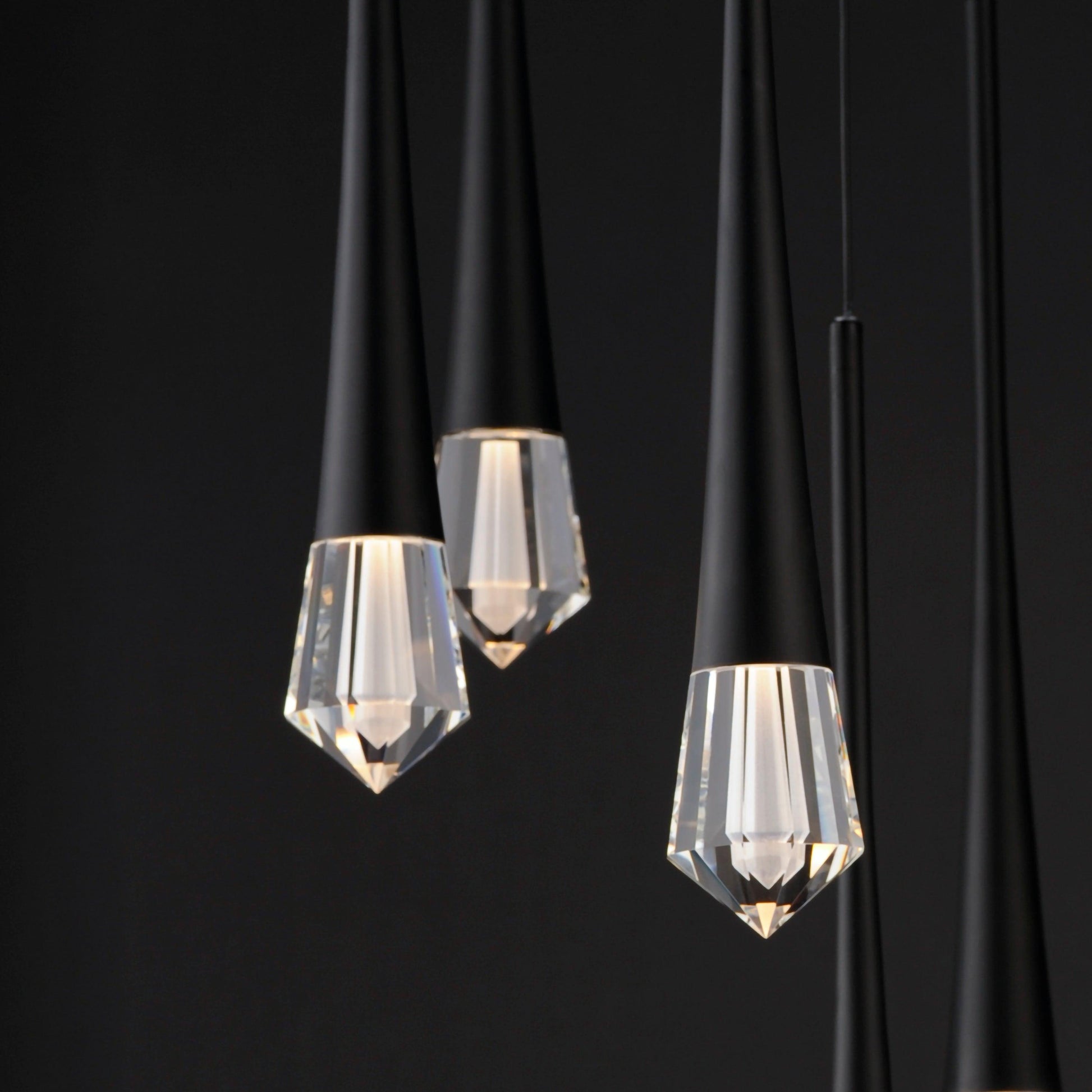 The Pierce Led Pendant profile with a piercing statement; this pendant features thin black wires supporting a tapered metal pendant. Recessed in this form is a high-powered LED that illuminates a brilliantly faceted crystal element with etched details inside its form to capture light and enhance its beauty. Available in Gold or Matte Black, the design complements modern and many transitional interiors. A coordinating ADA-compliant wall sconce was designed with a rigid stem for public spaces and has been sealed for use in damp locations.